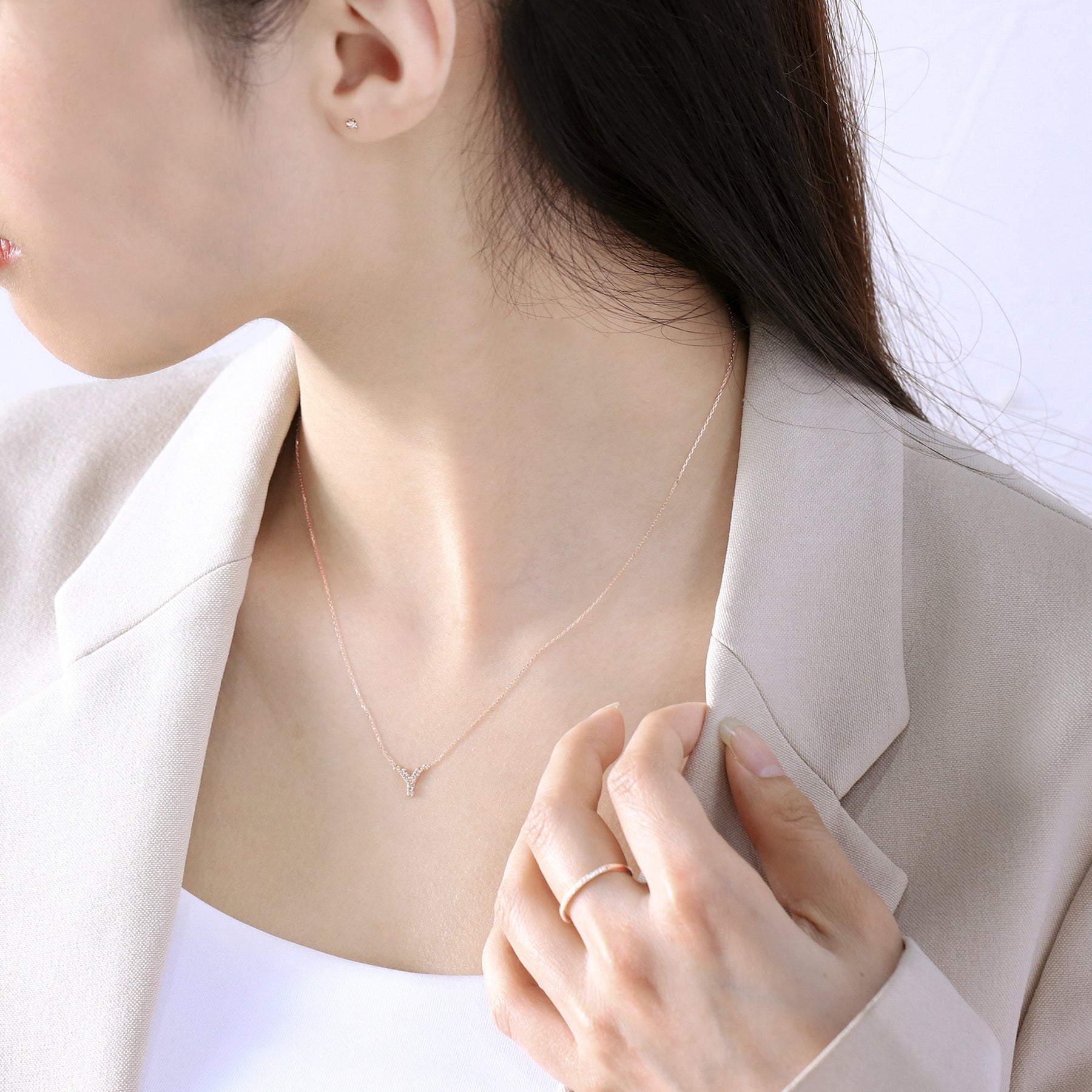 繊細なイエローゴールドのチェーンに、ダイヤモンドがきらめくイニシャルチャームをあしらった、上品なネックレス。