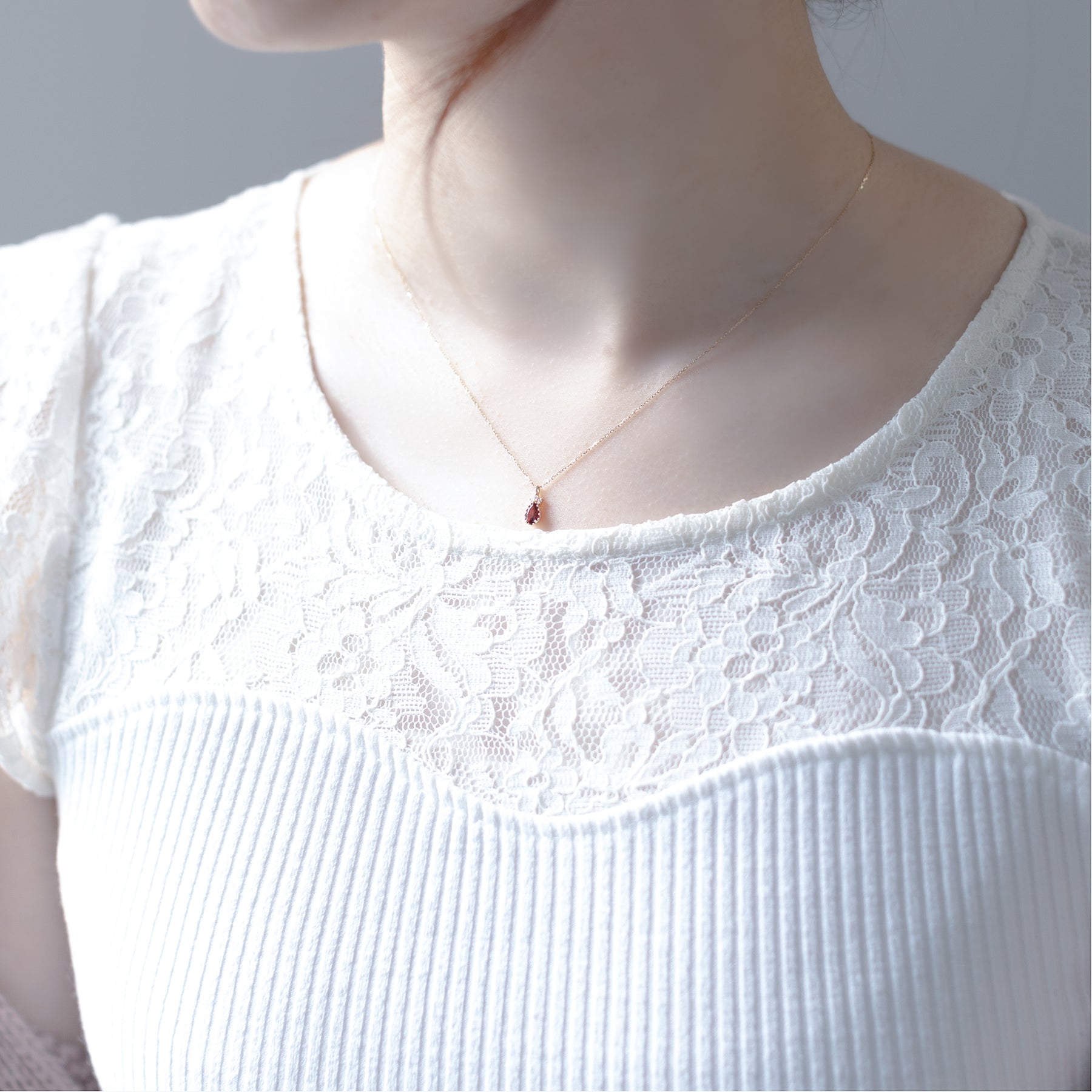 【Garnet】しずく型のガーネットが揺れるイエローゴールドのフックネックレス。深みのあるレッドカラーが、上品なアクセントになり、女性らしい華やぎを引き立てます。上品にきらめくキュービックジルコニアがしずく型のガーネットを引き立て、エレガントな印象に仕上げています。自分へのご褒美にはもちろん、大切な方へのギフトにもおすすめのアイテムです。ガーネットは1月の誕生石です。石言葉は「真実」「忠実」。目標に向かい、積み上げてきた努力の成果を実らせて、成功へと導いてくれると言われています。また、恋の成就をもたらせてくれると言われています。【ATTENTION】※熱や紫外線、湿度の影響により変色や変質、劣化の恐れがございます。ご使用後は柔らかな布で汚れを拭き取ってから、直射日光の当たらない場所での保管をお願いいたします。※天然石は素材の特性により、色や形、風合いなどが画像と多少異なる場合がございます。また、多少のインクルージョンやクラックがある場合がございます。予めご了承ください。※天然石は他の宝石と比べて柔らかく傷がつきやすいため、衝撃や摩擦にご注意ください。また、他のジュエリーと触れないように保管してください。※引っ張ったり、強い力を加えると不良や変形の原因となりますので、お取り扱いにはご注意ください。