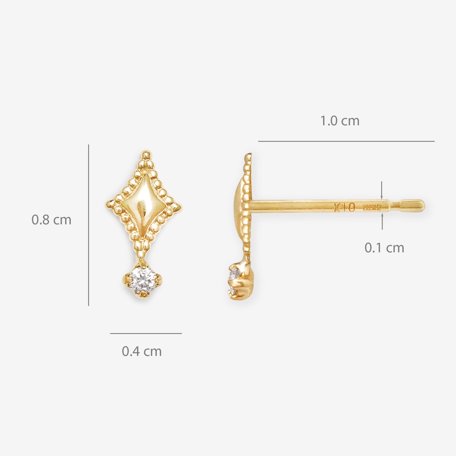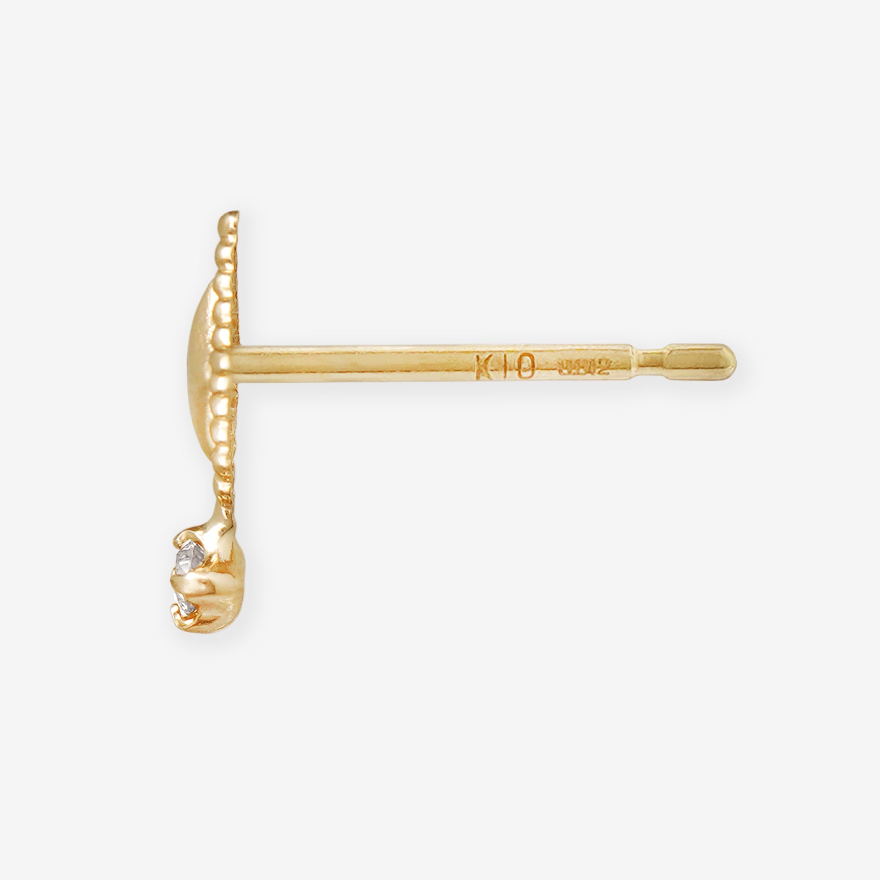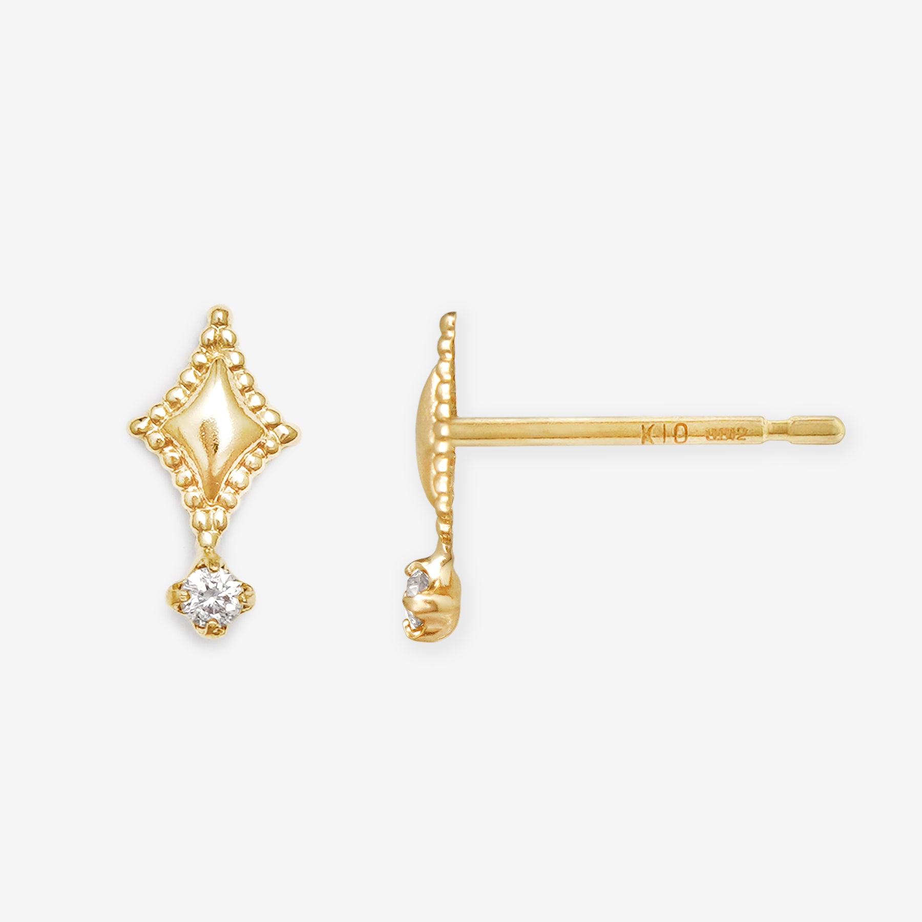 【FOR EARS】1粒のダイヤモンドが静かに輝く、K10イエローゴールドのピアス。アンティークのような繊細なモチーフが耳元にそっと寄り添い、上品な存在感を演出します。控えめながらも印象的なデザインは、大人の女性の魅力をさりげなく引き立てる一品。自分へのご褒美にはもちろん、誕生日や記念日など、大切な方へのギフトにもおすすめです。ダイヤモンドは4月の誕生石です。石言葉は「清浄無垢」「永遠の愛」。心身を浄化し周囲にある邪気を払ってくれる力があるとされています。最大の幸福を呼び込むサポートとなってくれそうです。 【ATTENTION】※熱や紫外線、湿度の影響により変色や変質、劣化の恐れがございます。ご使用後は柔らかな布で汚れを拭き取ってから、直射日光の当たらない場所での保管をお願いいたします。※天然石は素材の特性により、色や形、風合いなどが画像と多少異なる場合がございます。また、多少のインクルージョンやクラックがある場合がございます。予めご了承ください。※強い力を加えると変形の原因になりますので、お取り扱いにはご注意ください。