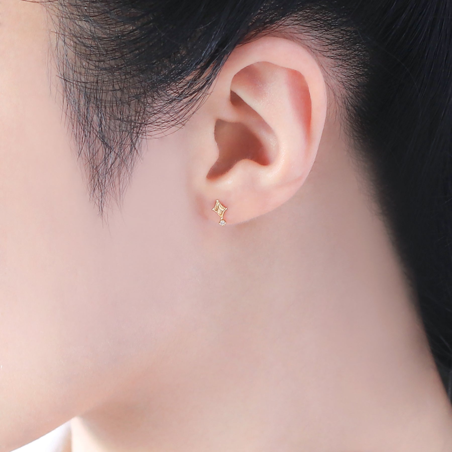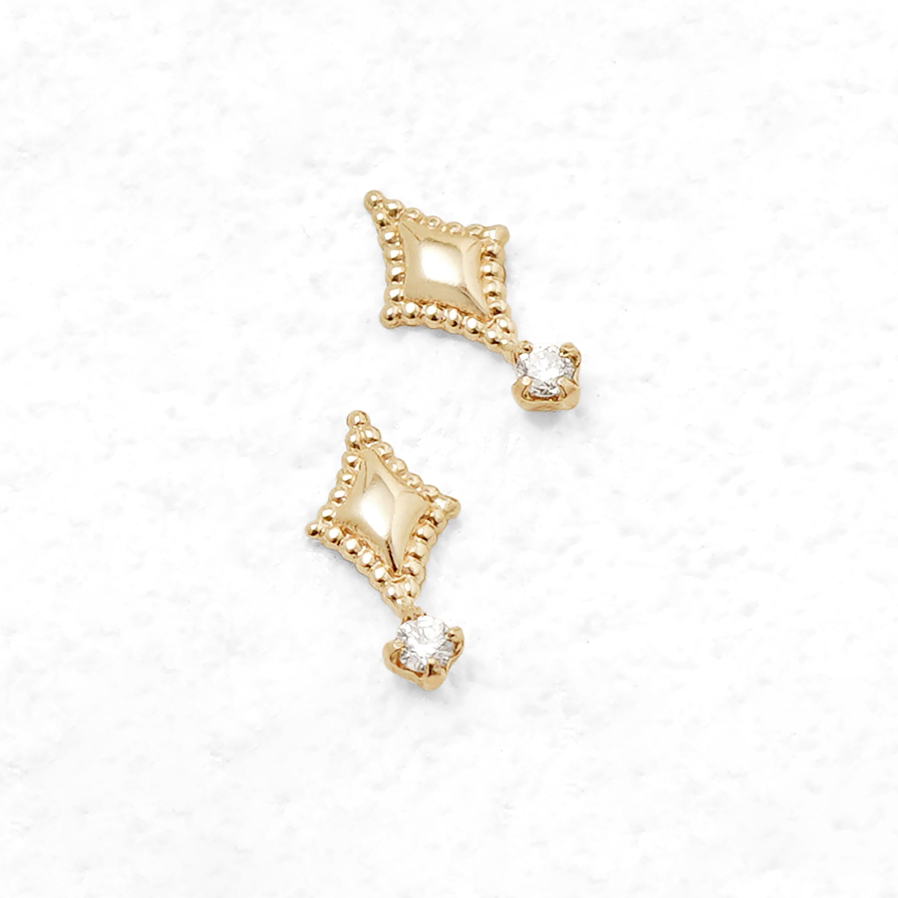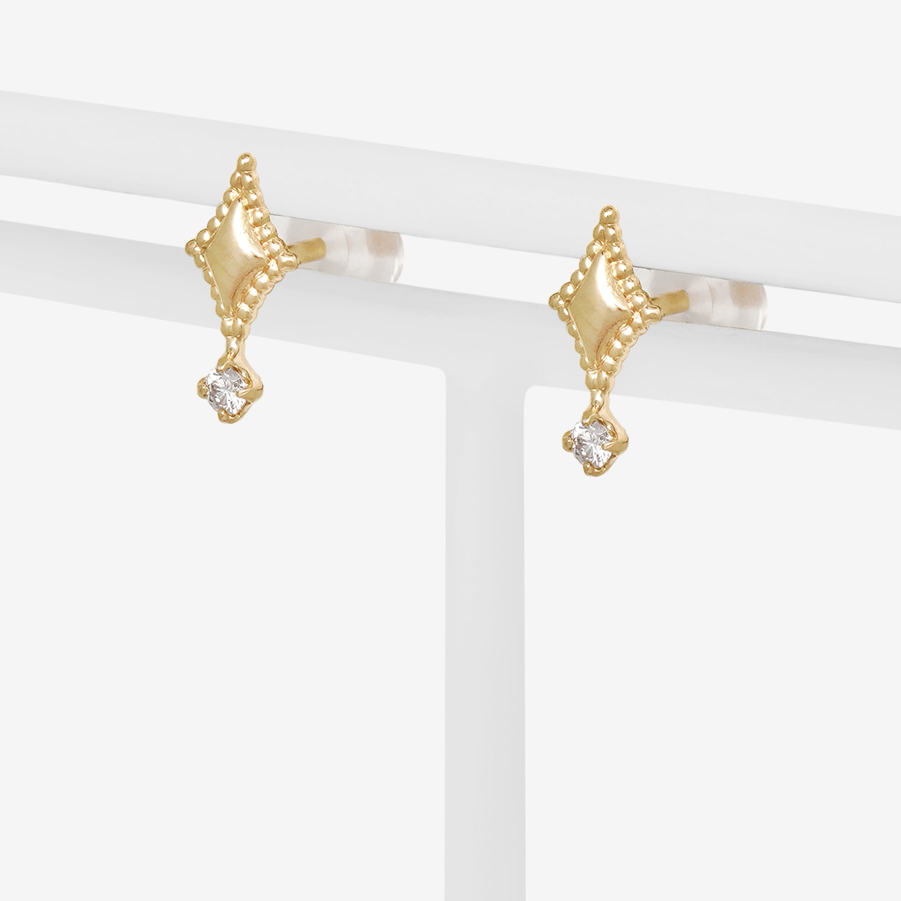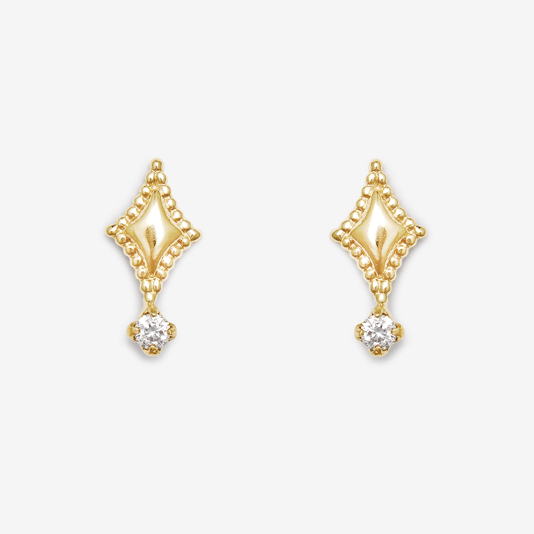 【FOR EARS】1粒のダイヤモンドが静かに輝く、K10イエローゴールドのピアス。アンティークのような繊細なモチーフが耳元にそっと寄り添い、上品な存在感を演出します。控えめながらも印象的なデザインは、大人の女性の魅力をさりげなく引き立てる一品。自分へのご褒美にはもちろん、誕生日や記念日など、大切な方へのギフトにもおすすめです。ダイヤモンドは4月の誕生石です。石言葉は「清浄無垢」「永遠の愛」。心身を浄化し周囲にある邪気を払ってくれる力があるとされています。最大の幸福を呼び込むサポートとなってくれそうです。 【ATTENTION】※熱や紫外線、湿度の影響により変色や変質、劣化の恐れがございます。ご使用後は柔らかな布で汚れを拭き取ってから、直射日光の当たらない場所での保管をお願いいたします。※天然石は素材の特性により、色や形、風合いなどが画像と多少異なる場合がございます。また、多少のインクルージョンやクラックがある場合がございます。予めご了承ください。※強い力を加えると変形の原因になりますので、お取り扱いにはご注意ください。