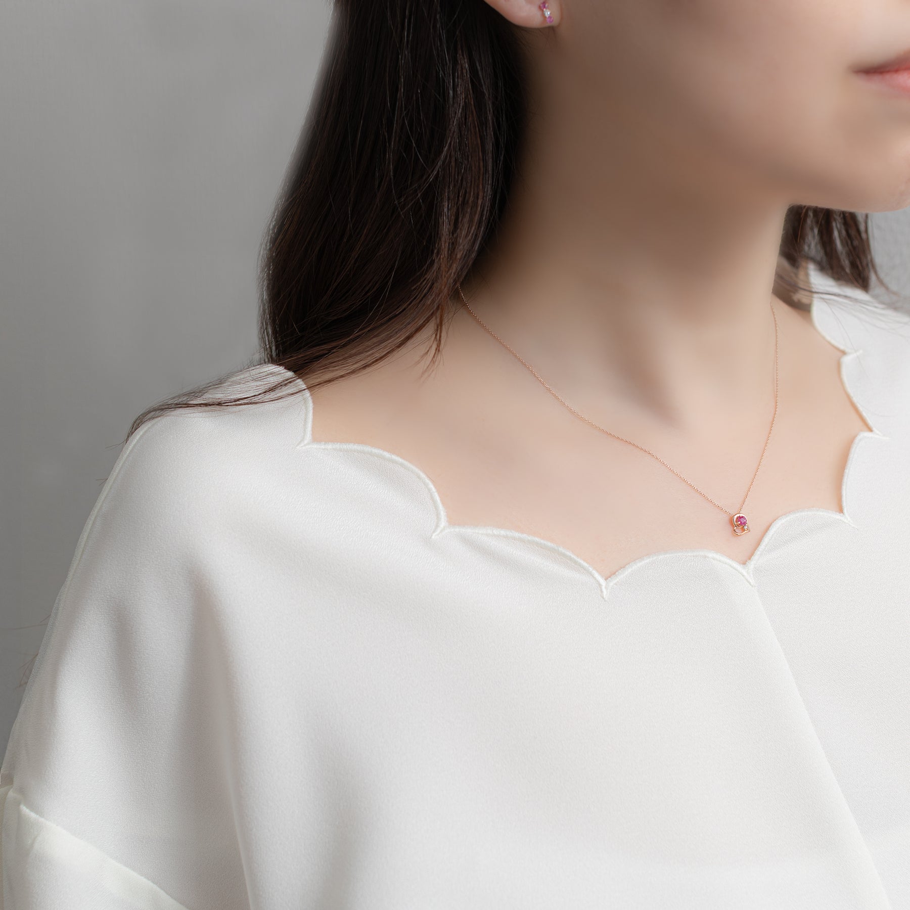 ハートの中にルビーとダイヤモンドをあしらった、愛らしいネックレスです。ピンク色のルビーが、女性らしさをさらにプラスしてくれます。