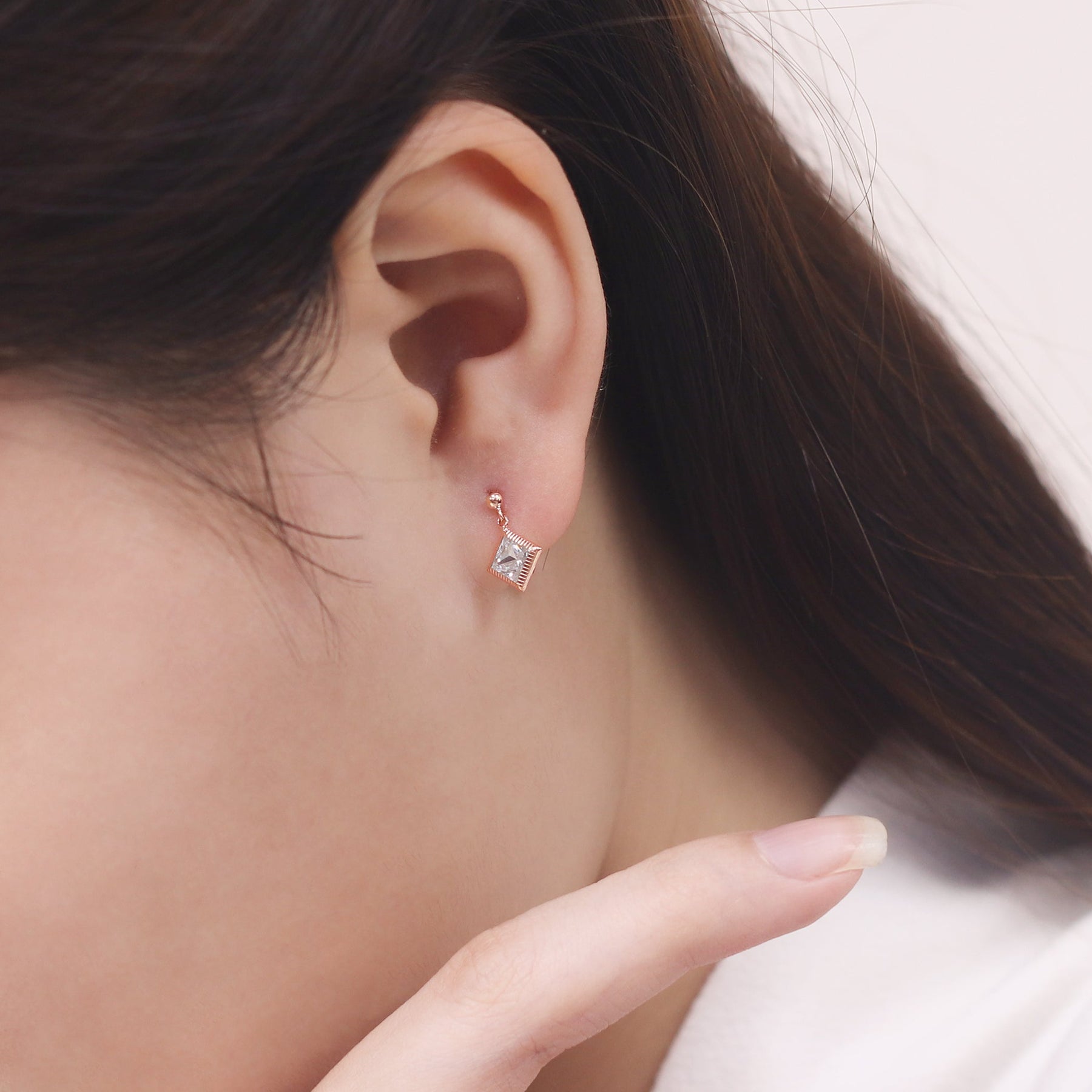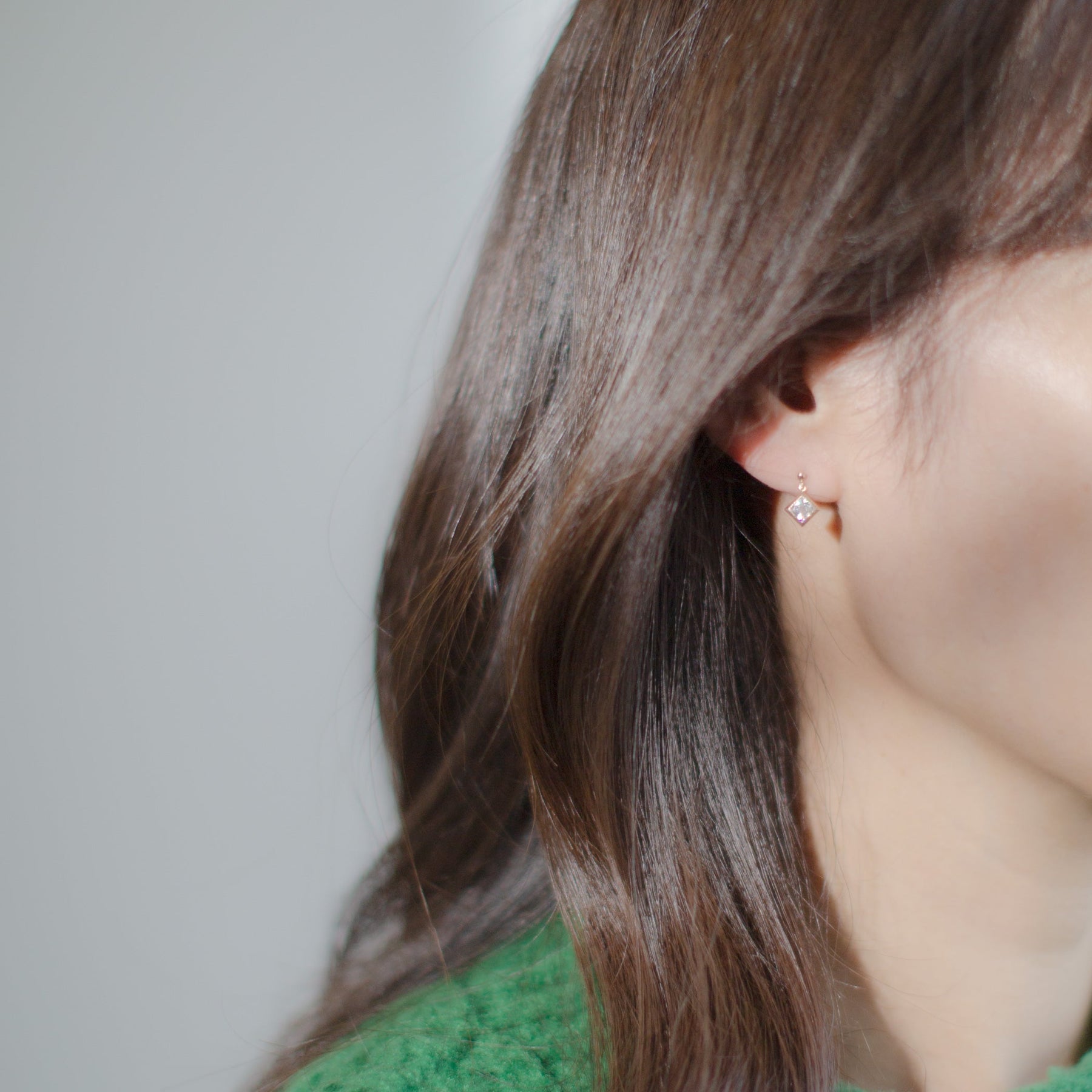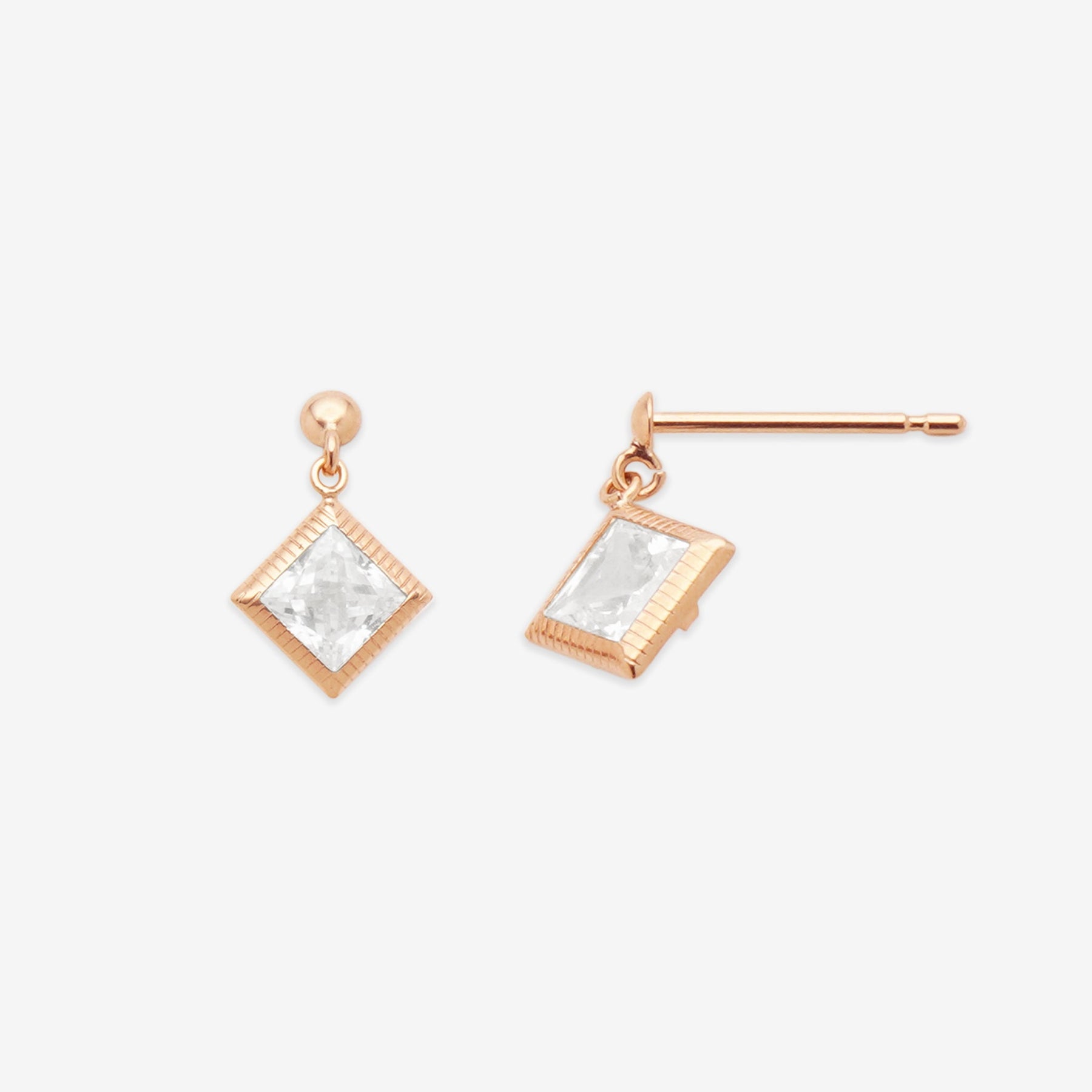 スクエアカットのキュービックジルコニアが輝くピンクゴールドのピアス。