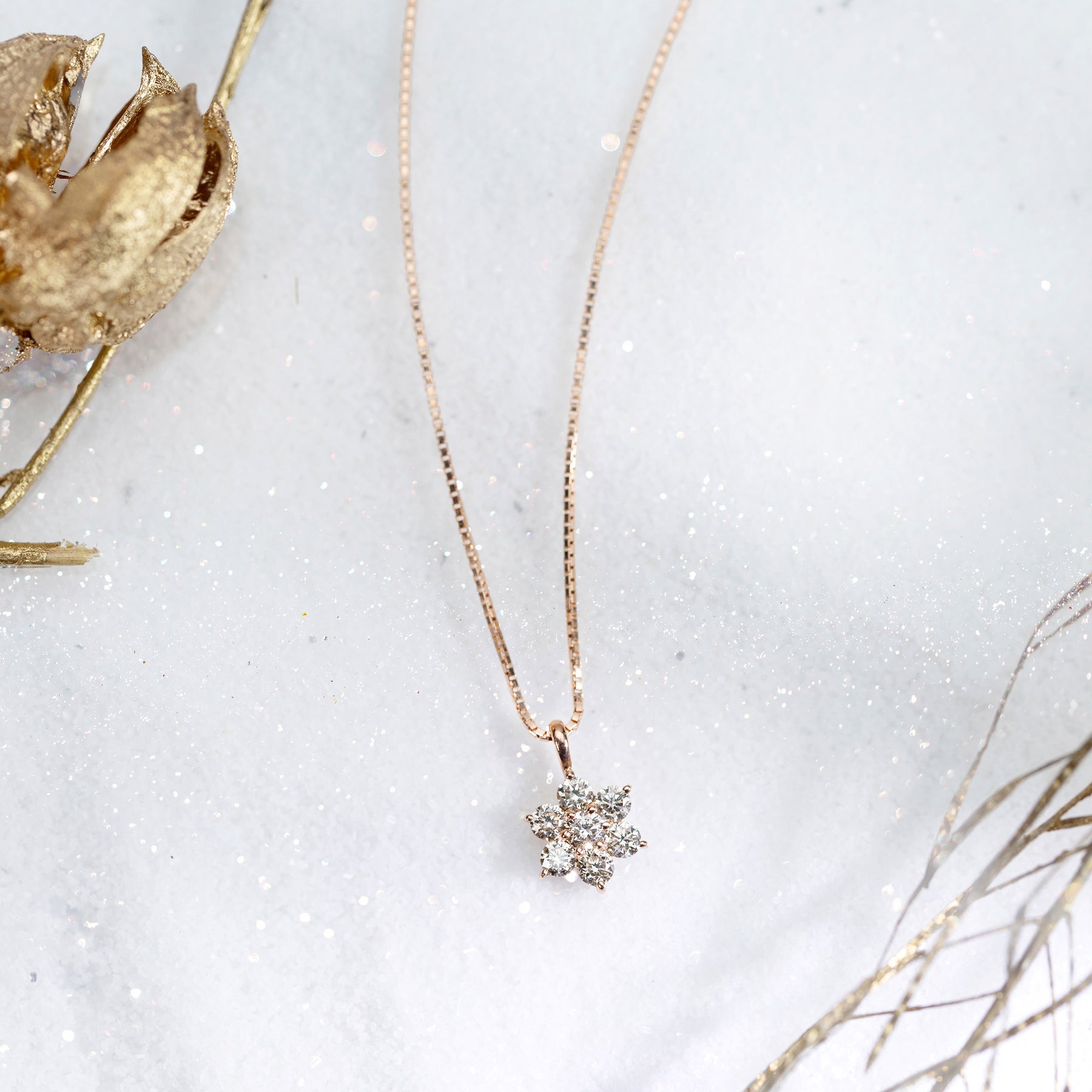 【SEVEN STARS】道しるべの星のように7つのダイヤモンドが輝く、ピンクゴールドのネックレス。7石のダイヤモンドを星の形にセッティングし、まるで大粒のダイヤモンドであるかのようなきらめきを演出しました。セブンスターのモチーフには「希望」「願いの成就」などの意味が込められております。トータル0.36カラットのダイヤモンドが胸元で華やかに輝きます。高級感があるベネチアンチェーンが上品。スライドアジャスター付きなので、首元の詰まった服の時は長め、Vネックなどの時は短め…などお好みの長さに調整することが可能です。ダイヤモンドは4月の誕生石です。石言葉は「清浄無垢」「永遠の愛」。心身を浄化し周囲にある邪気を払ってくれる力があるとされています。最大の幸福を呼び込むサポートとなってくれそうです。 ◆こちらの商品は、地金変更のセミオーダーが可能です。・詳細は、こちら・対象商品は、こちらからご覧いただけます。【ATTENTION】※熱や紫外線、湿度の影響により変色や変質、劣化の恐れがございます。ご使用後は柔らかな布で汚れを拭き取ってから、直射日光の当たらない場所での保管をお願いいたします。※天然石は素材の特性により、色や形、風合いなどが画像と多少異なる場合がございます。また、多少のインクルージョンやクラックがある場合がございます。予めご了承ください。※引っ張ったり、強い力を加えると不良や変形の原因となりますので、お取り扱いにはご注意ください。