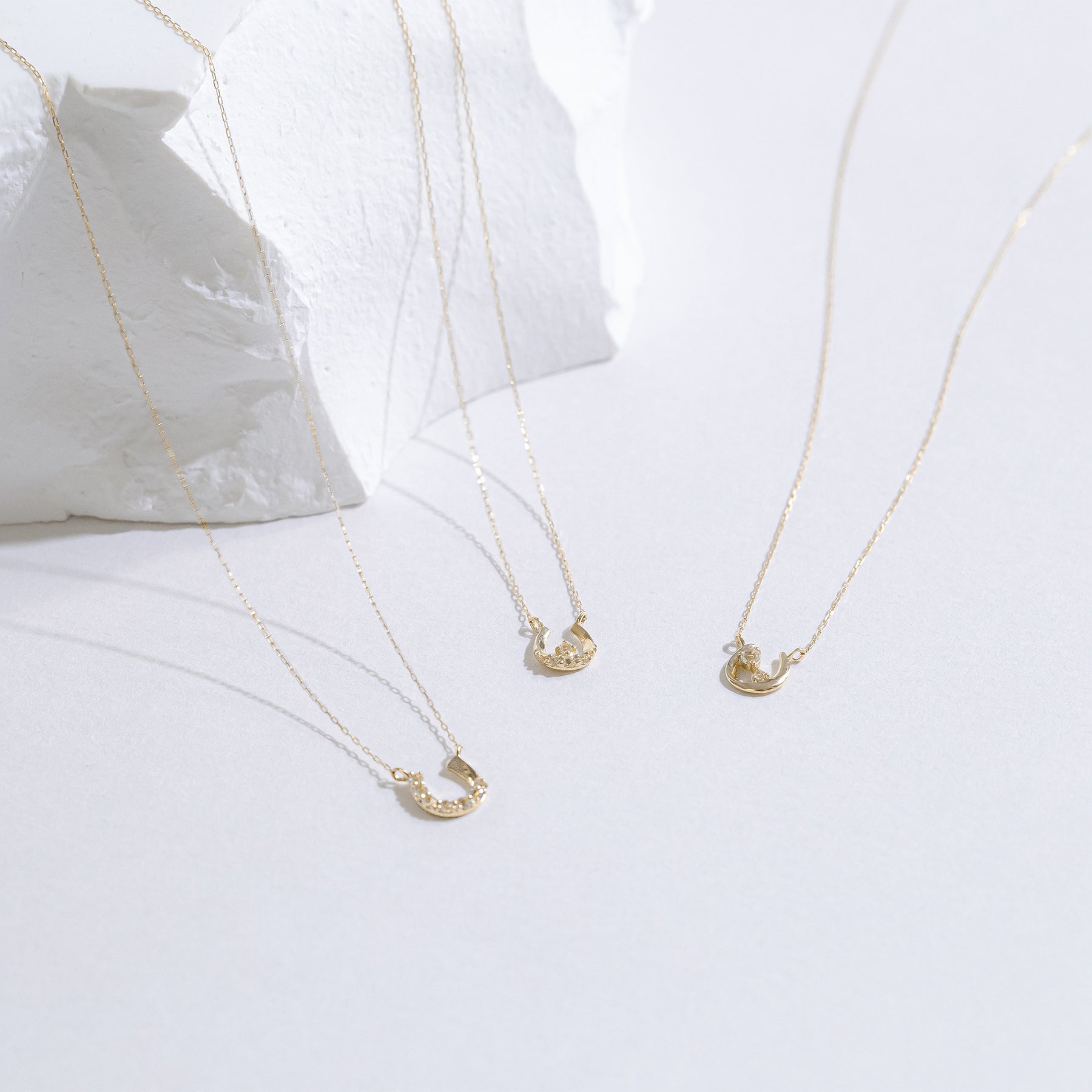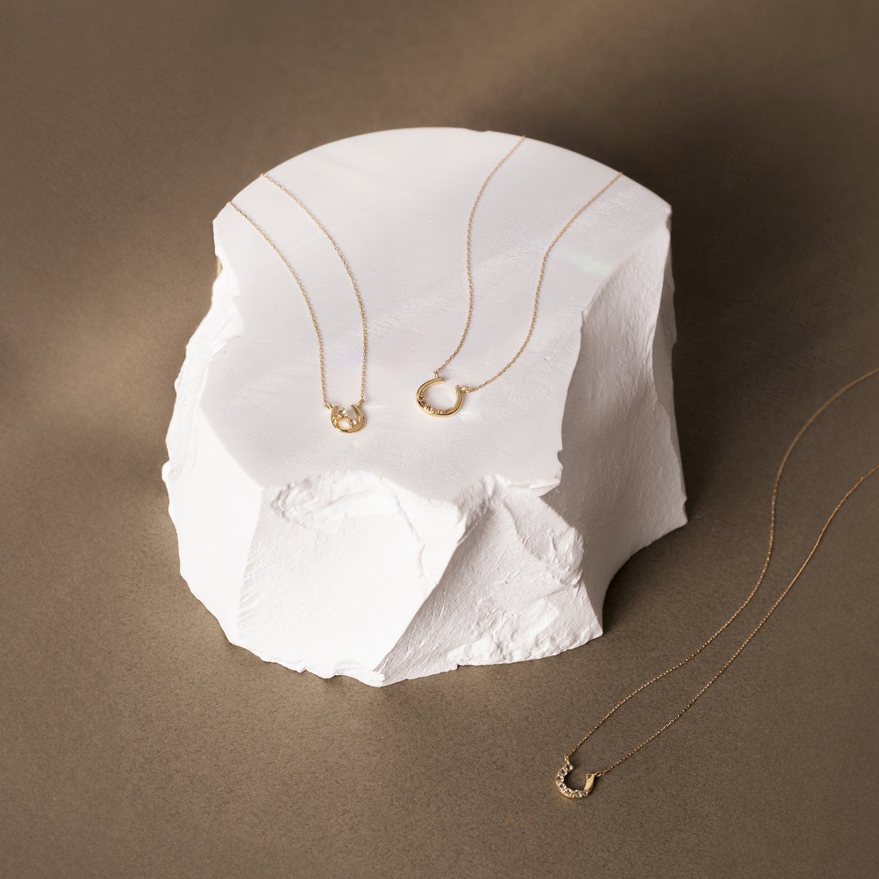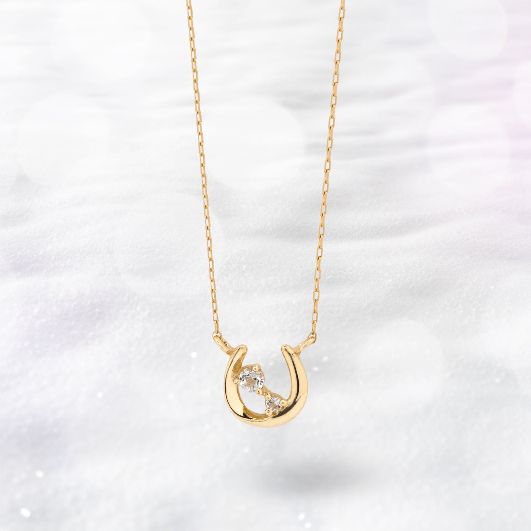 馬蹄モチーフでホワイトトパーズが輝くイエローゴールドのネックレス。