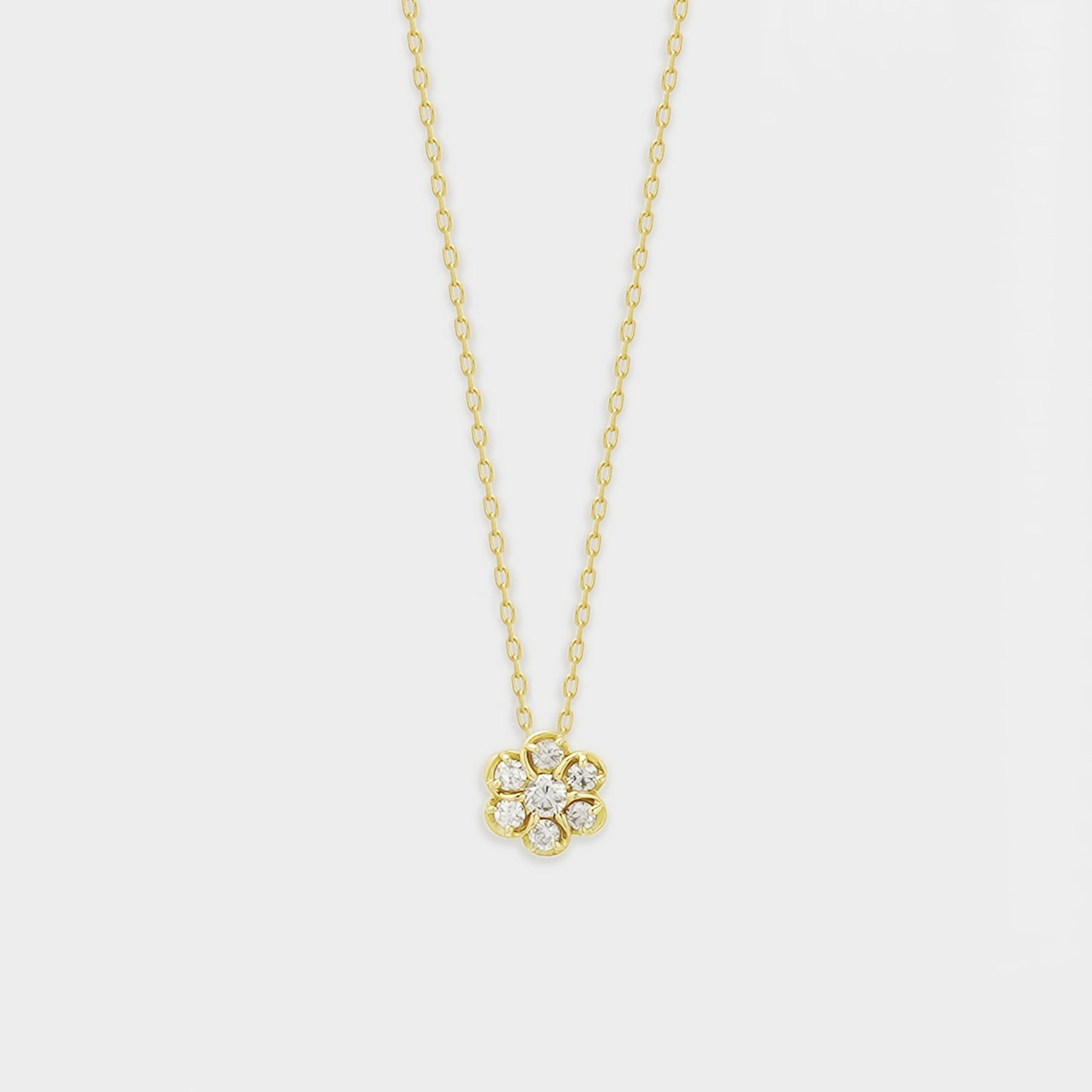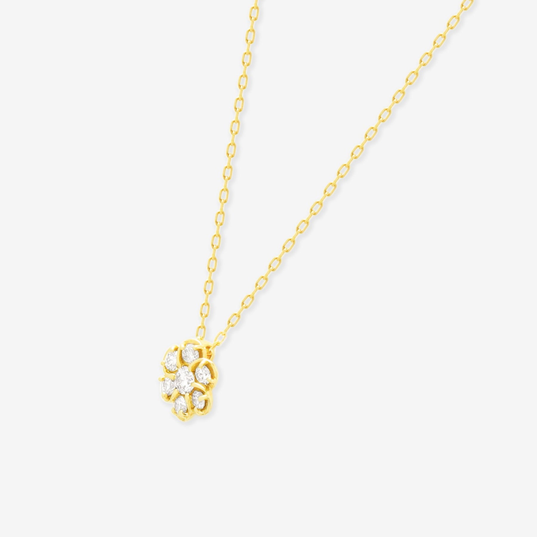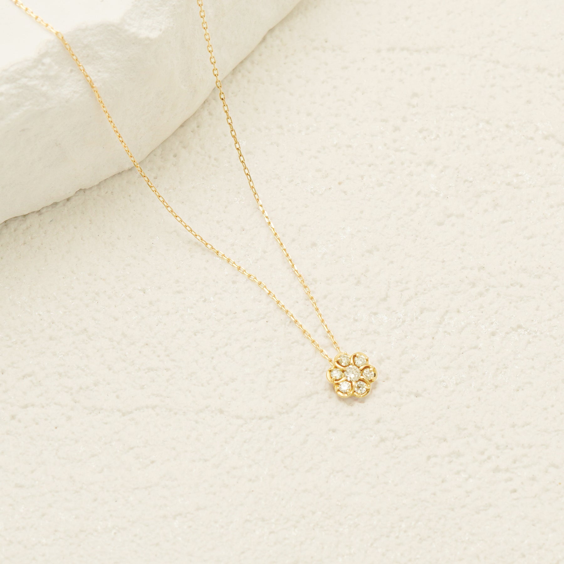 【Diamond】フラワーモチーフにダイヤモンドがきらめく、イエローゴールドのネックレス。ダイヤモンドでかたどった花のモチーフが、イエローゴールドの温かな輝きと調和し、胸元に上質な華やぎを添えます。日常のスタイルにさりげないエレガンスをプラスするだけでなく、記念日や誕生日のギフトにもふさわしい一品です。ダイヤモンドは4月の誕生石です。石言葉は「清浄無垢」「永遠の愛」。心身を浄化し周囲にある邪気を払ってくれる力があるとされています。最大の幸福を呼び込むサポートとなってくれそうです。【ATTENTION】※熱や紫外線、湿度の影響により変色や変質、劣化の恐れがございます。ご使用後は柔らかな布で汚れを拭き取ってから、直射日光の当たらない場所での保管をお願いいたします。※天然石は素材の特性により、色や形、風合いなどが画像と多少異なる場合がございます。また、多少のインクルージョンやクラックがある場合がございます。予めご了承ください。※引っ張ったり、強い力を加えると不良や変形の原因となりますので、お取り扱いにはご注意ください。