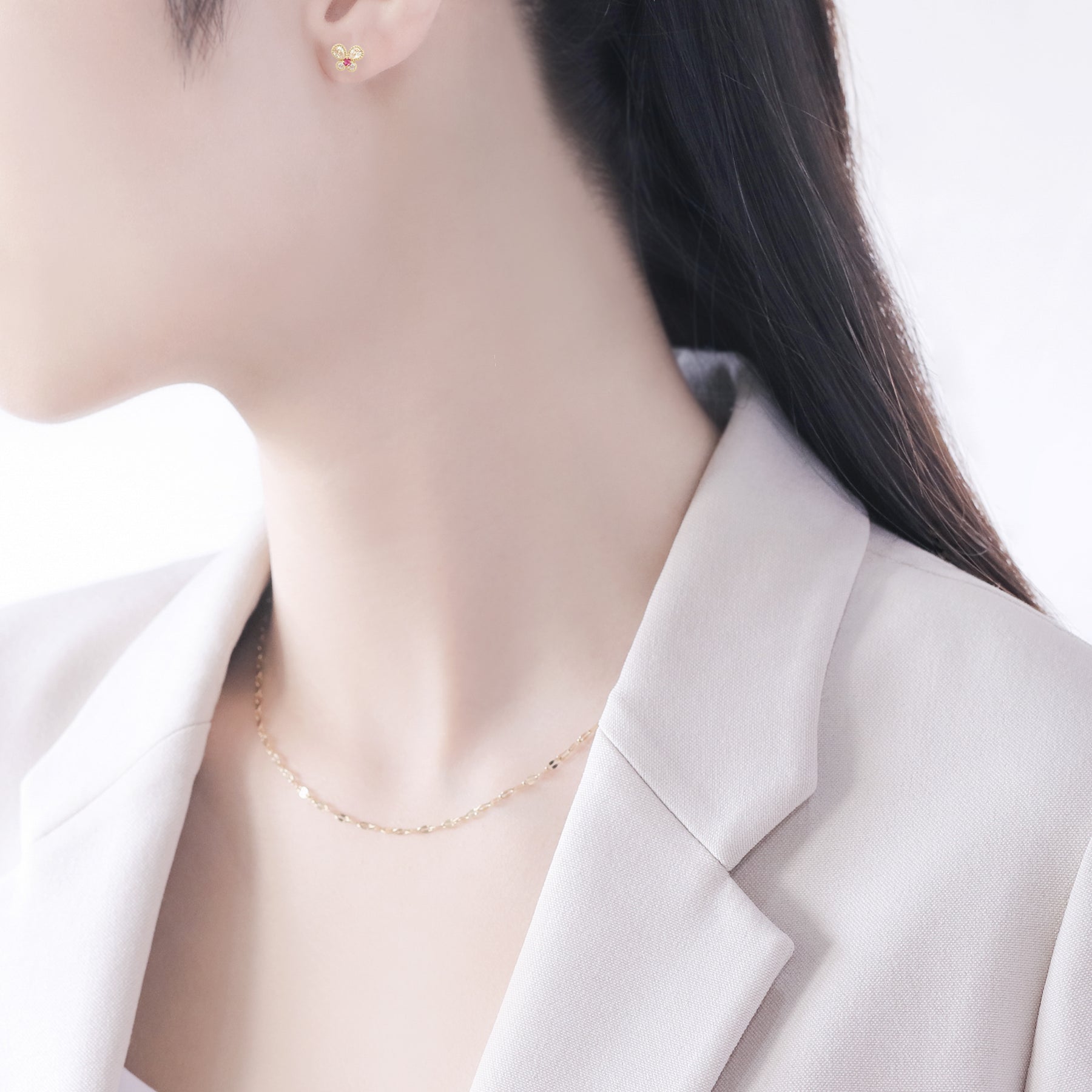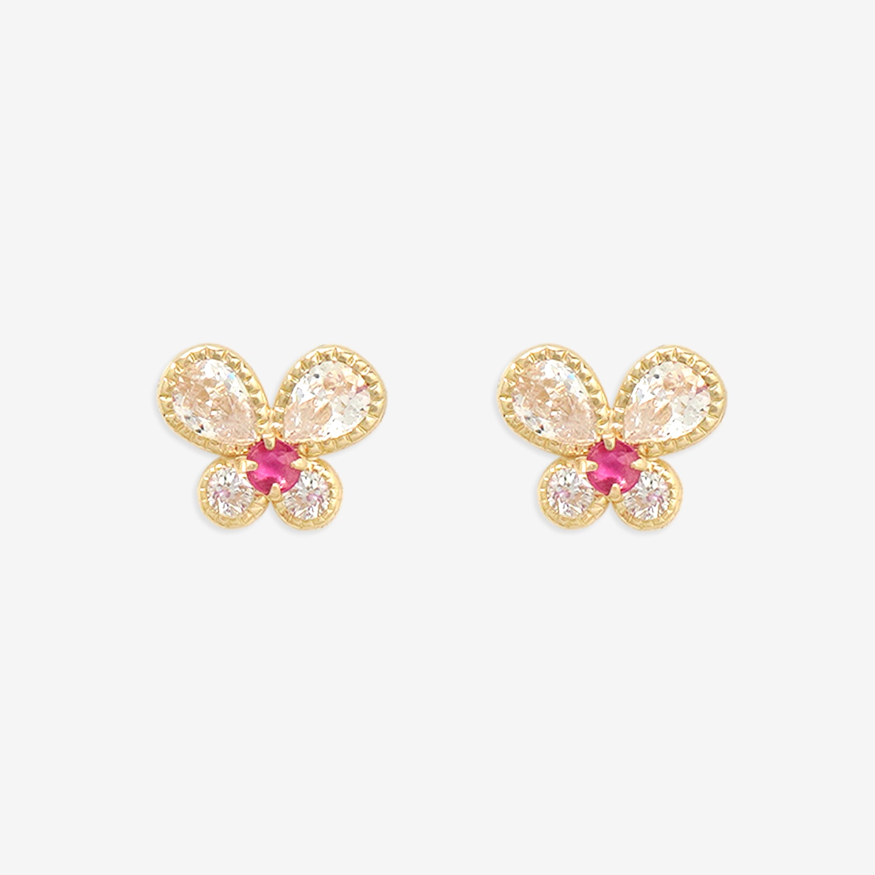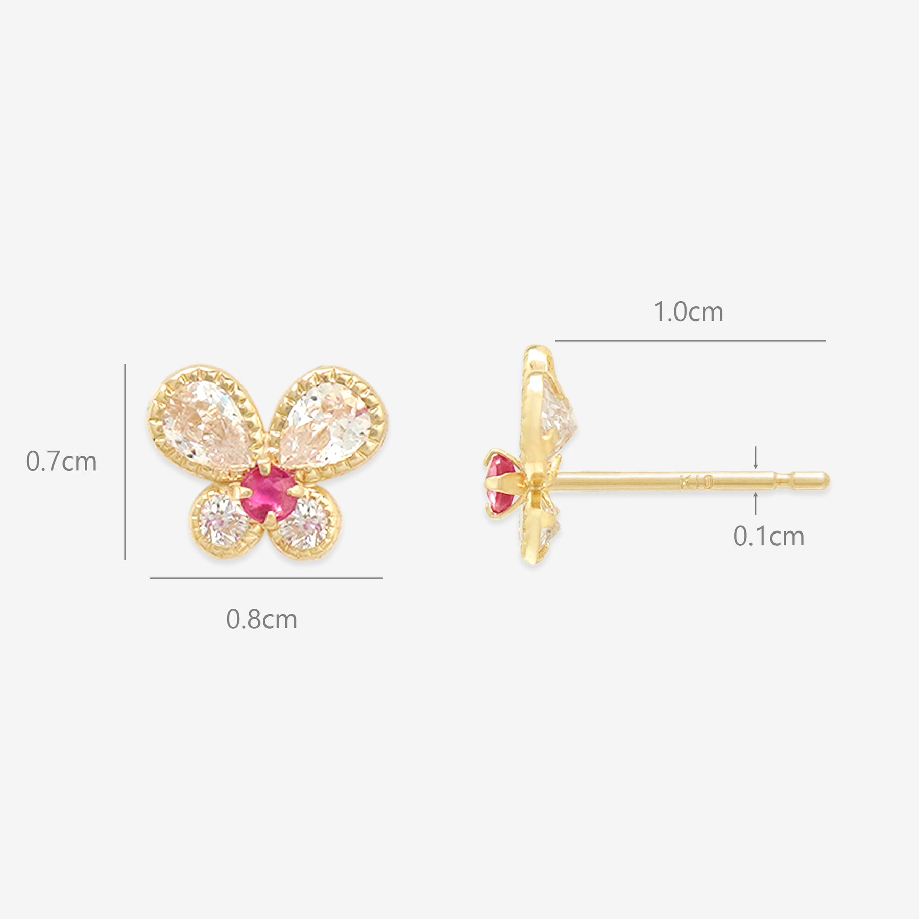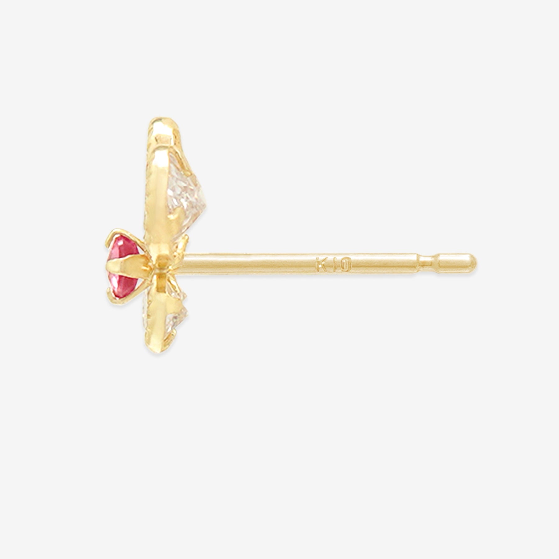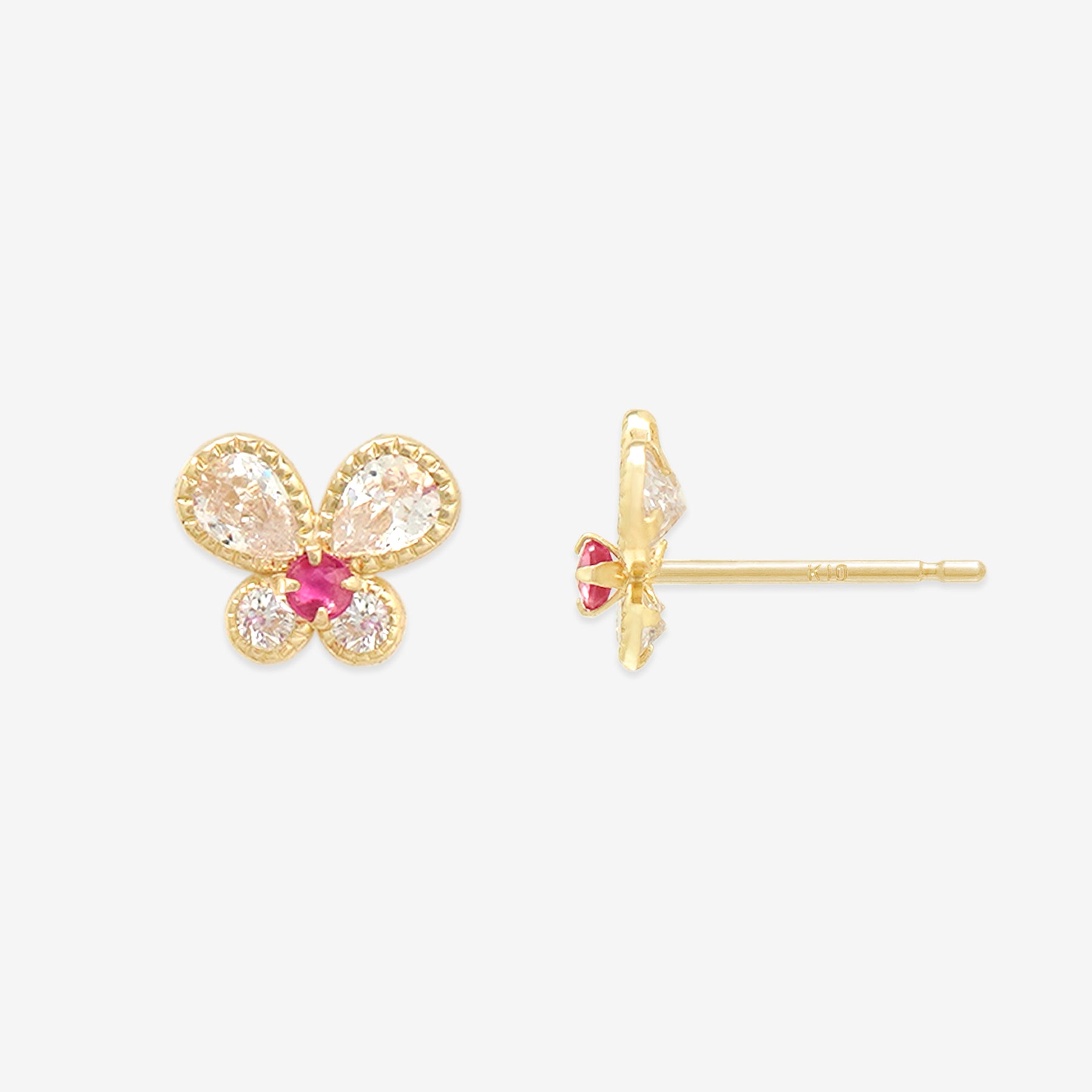 【FOR EARS】バタフライモチーフにルビーが彩りを添える、イエローゴールドのピアス。キュービックジルコニアが、鮮やかなルビーを引き立て、光を受けて繊細にきらめきます。可愛らしさの中に上品さを感じさせるデザインは、耳元に華やかなアクセントを添えてくれます。日常のコーディネートにはもちろん、特別な日の装いにも映える存在感。自分へのご褒美にはもちろん、大切な人へのギフトにもおすすめのアイテムです。ルビーは7月の誕生石です。石言葉は、「情熱」「純愛」。情熱的なパワーを持つルビーは、愛を手に入れたい人、強くなりたい人にとって、最高のパワーストーンです。【ATTENTION】※熱や紫外線、湿度の影響により変色や変質、劣化の恐れがございます。ご使用後は柔らかな布で汚れを拭き取ってから、直射日光の当たらない場所での保管をお願いいたします。※天然石は素材の特性により、色や形、風合いなどが画像と多少異なる場合がございます。また、多少のインクルージョンやクラックがある場合がございます。予めご了承ください。※天然石は他の宝石と比べて柔らかく傷がつきやすいため、衝撃や摩擦にご注意ください。また、他のジュエリーと触れないように保管してください。※強い力を加えると変形の原因になりますので、お取り扱いにはご注意ください。
