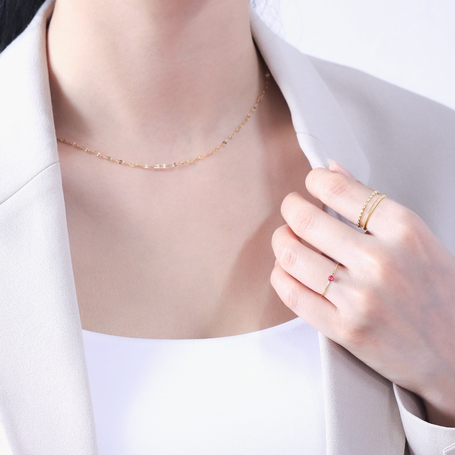 【Birthstone Collection】1粒のルビーが、情熱的で華やかな印象を添えるイエローゴールドのリング。鮮やかな赤のルビーの輝きが、ゴールドの繊細な輝きと美しく調和し、凛とした美しさを指先に宿します。シンプルながらも洗練されたデザインは、オフィススタイルにも自然に馴染み、日常にさりげない華やかさをプラス。忙しい毎日を過ごす大人の女性にこそふさわしいシンプルなジュエリーは、自分へのご褒美としてはもちろん、大切な方へのギフトにもおすすめです。ルビーは7月の誕生石です。石言葉は、「情熱」「純愛」。情熱的なパワーを持つルビーは、愛を手に入れたい人、強くなりたい人にとって、最高のパワーストーンです。【ATTENTION】※熱や紫外線、湿度の影響により変色や変質、劣化の恐れがございます。ご使用後は柔らかな布で汚れを拭き取ってから、直射日光の当たらない場所での保管をお願いいたします。※天然石は素材の特性により、色や形、風合いなどが画像と多少異なる場合がございます。また、多少のインクルージョンやクラックがある場合がございます。予めご了承ください。※天然石は他の宝石と比べて柔らかく傷がつきやすいため、衝撃や摩擦にご注意ください。また、他のジュエリーと触れないように保管してください。※強い力を加えると変形の原因になりますので、お取り扱いにはご注意ください。