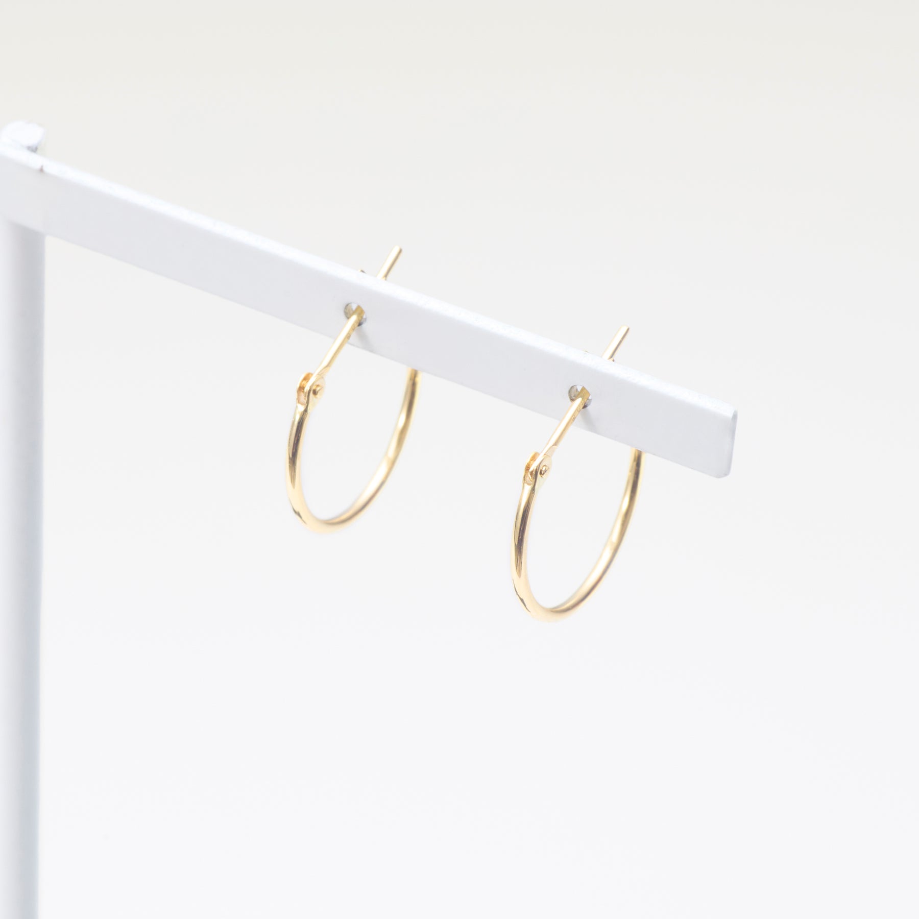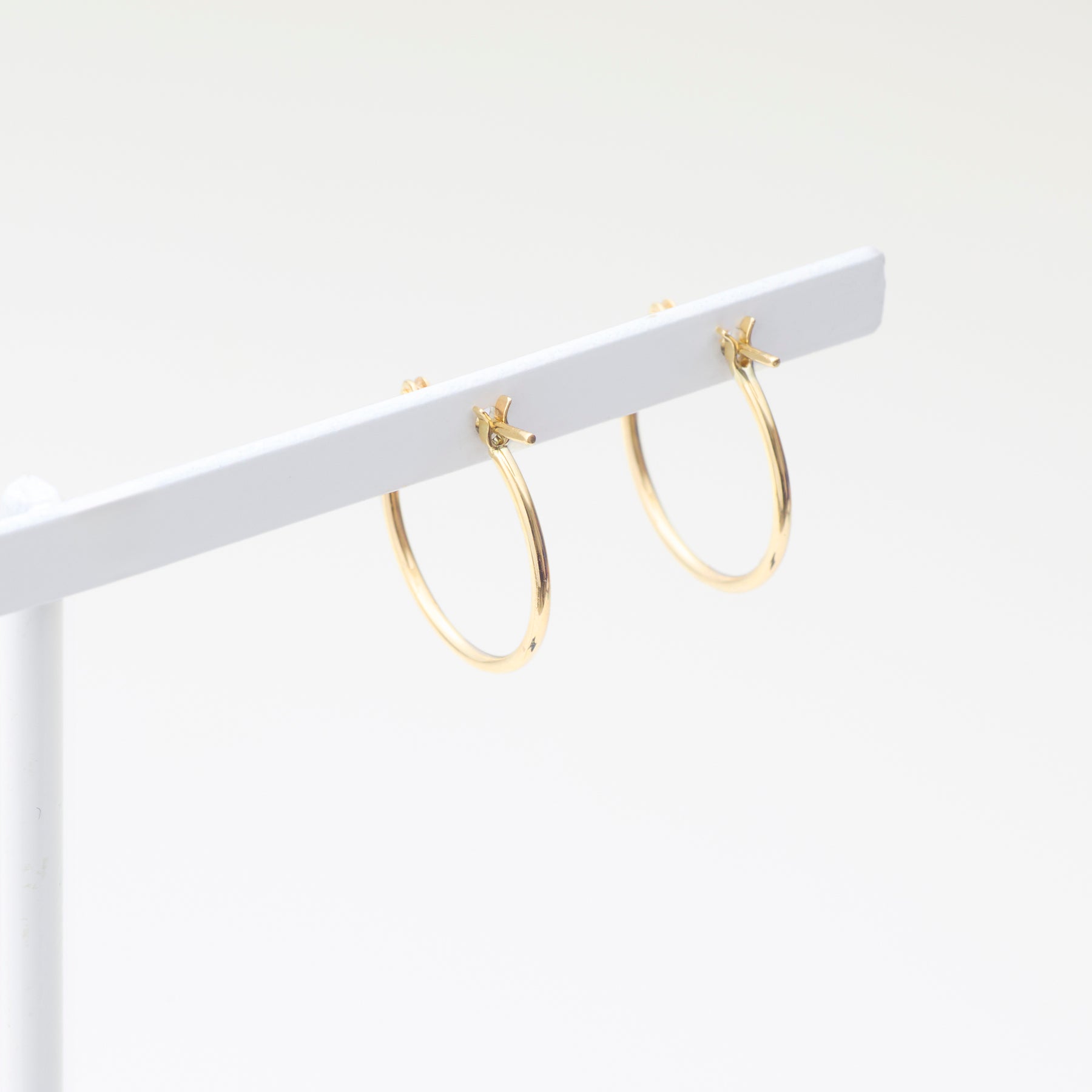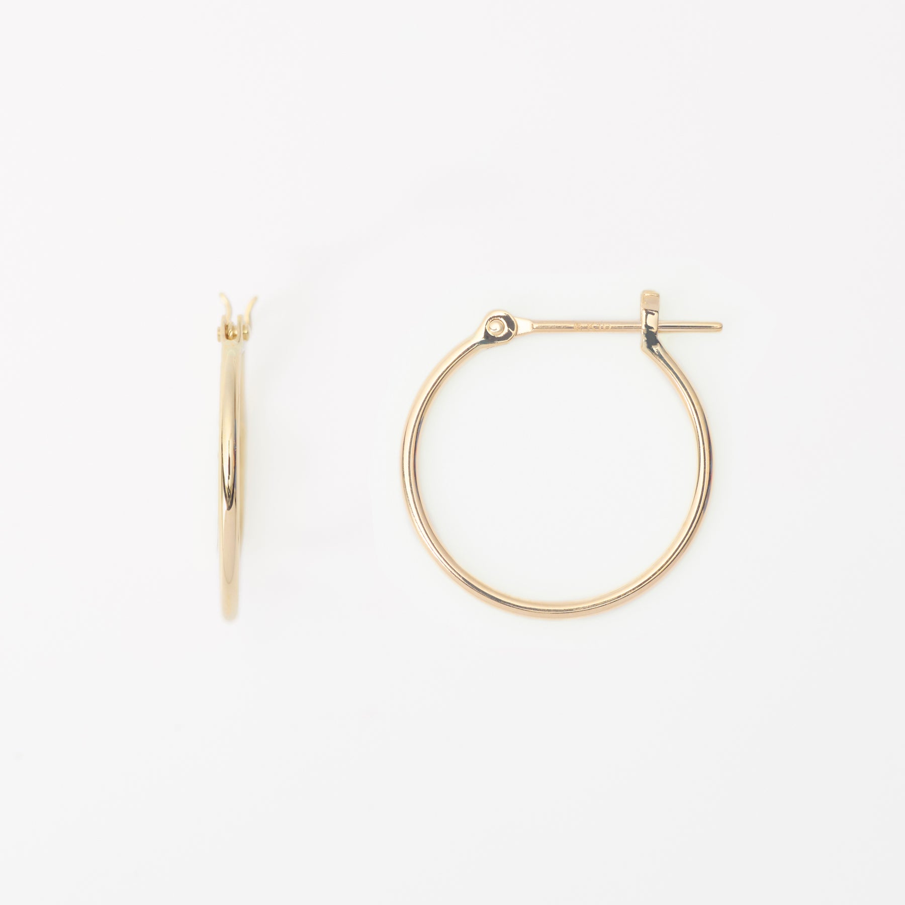 洗練されたシンプルなデザインが、女性らしさを引き立てるイエローゴールドのフープピアス。