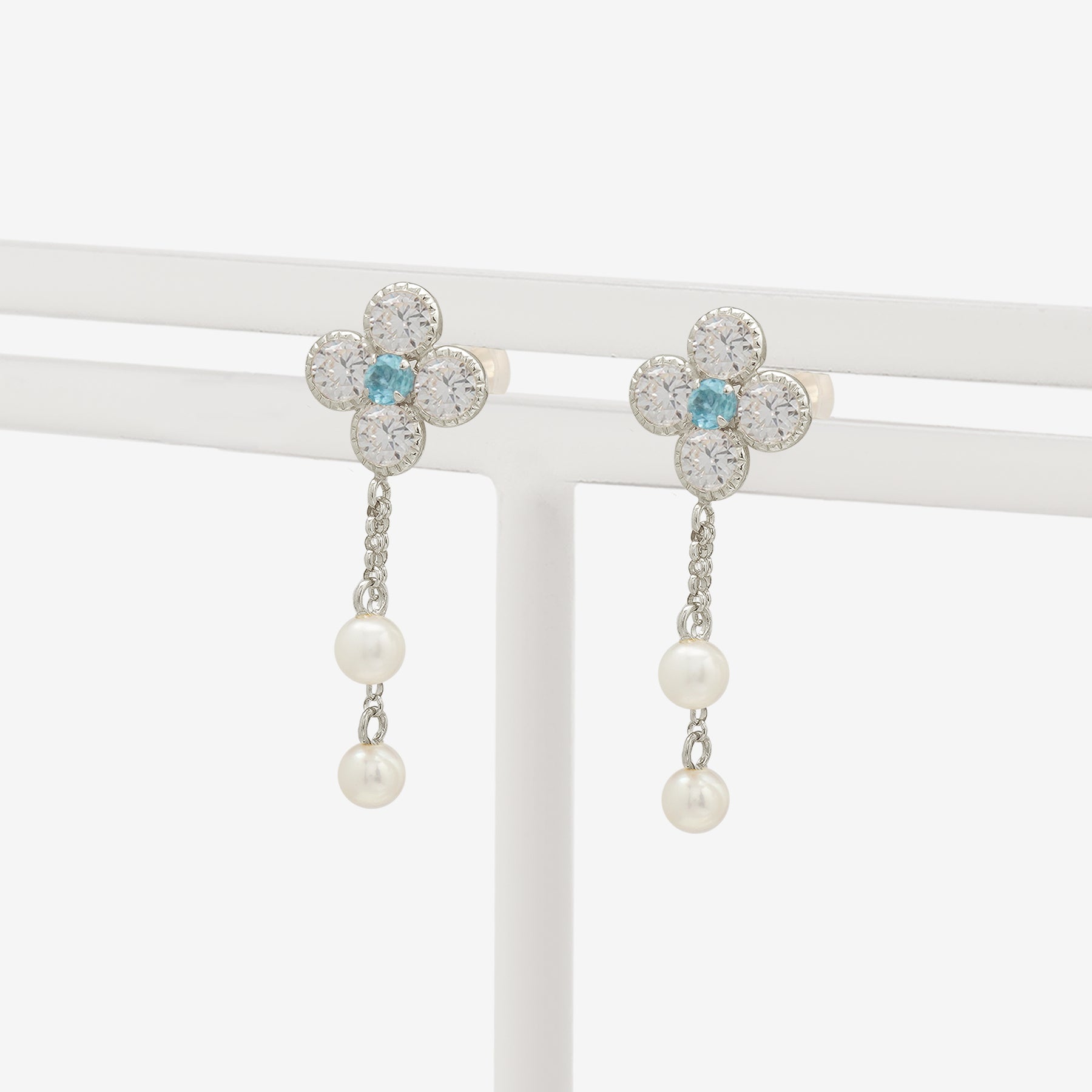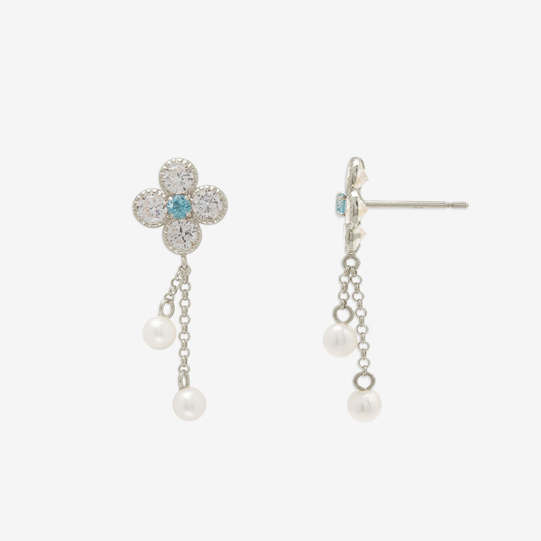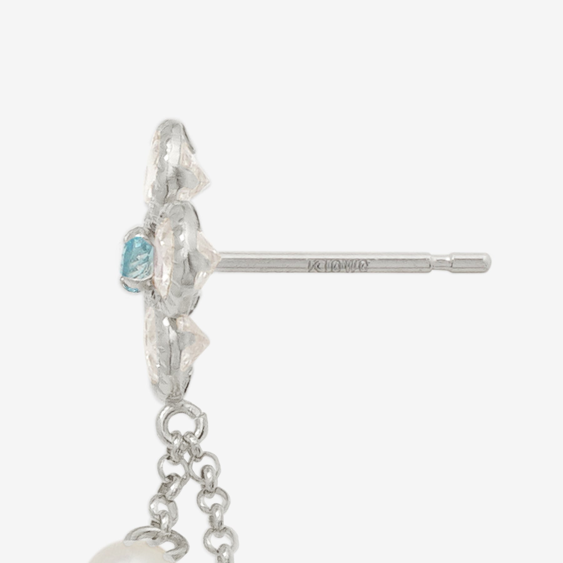 【FOR EARS】フラワーモチーフにブルートパーズがアクセントを添える、清楚なホワイトゴールドのピアス。キュービックジルコニアが鮮やかなブルートパーズを引き立て、優雅に揺れる淡水パールが動きに合わせて上品な印象を演出します。ホワイトゴールドの澄んだ輝きが、ブルートパーズの美しさをより一層引き立て、涼やかで洗練された雰囲気に。華やかさと繊細さを兼ね備えたデザインは、特別な日の装いを一層引き立ててくれます。フェミニンなスタイルにはもちろん、シンプルなコーディネートにも美しく映える存在感。自分へのご褒美や、大切な人へのギフトにもおすすめのアイテムです。ブルートパーズは11月の誕生石です。石言葉は「友情」「希望」「知性」。教養や知性を高め、仕事運や勉強運を高めてくれると言われています。また、「運命的な出会いをもたらす石」と言われています。【ATTENTION】※熱や紫外線、湿度の影響により変色や変質、劣化の恐れがございます。ご使用後は柔らかな布で汚れを拭き取ってから、直射日光の当たらない場所での保管をお願いいたします。※天然石は素材の特性により、色や形、風合いなどが画像と多少異なる場合がございます。また、多少のインクルージョンやクラックがある場合がございます。予めご了承ください。※天然石は他の宝石と比べて柔らかく傷がつきやすいため、衝撃や摩擦にご注意ください。また、他のジュエリーと触れないように保管してください。※強い力を加えると変形の原因になりますので、お取り扱いにはご注意ください。