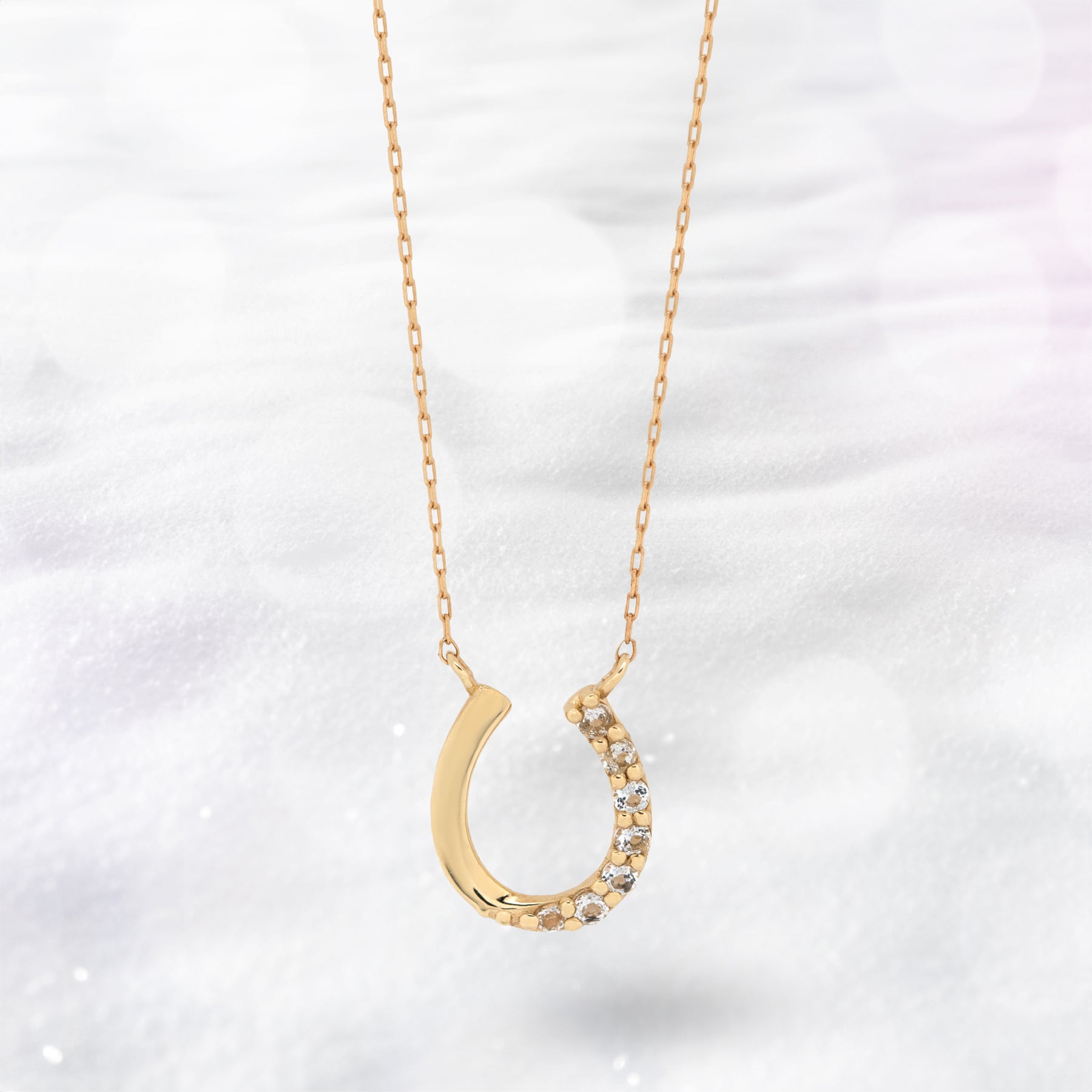 馬蹄モチーフでホワイトトパーズが輝くイエローゴールドのネックレス。