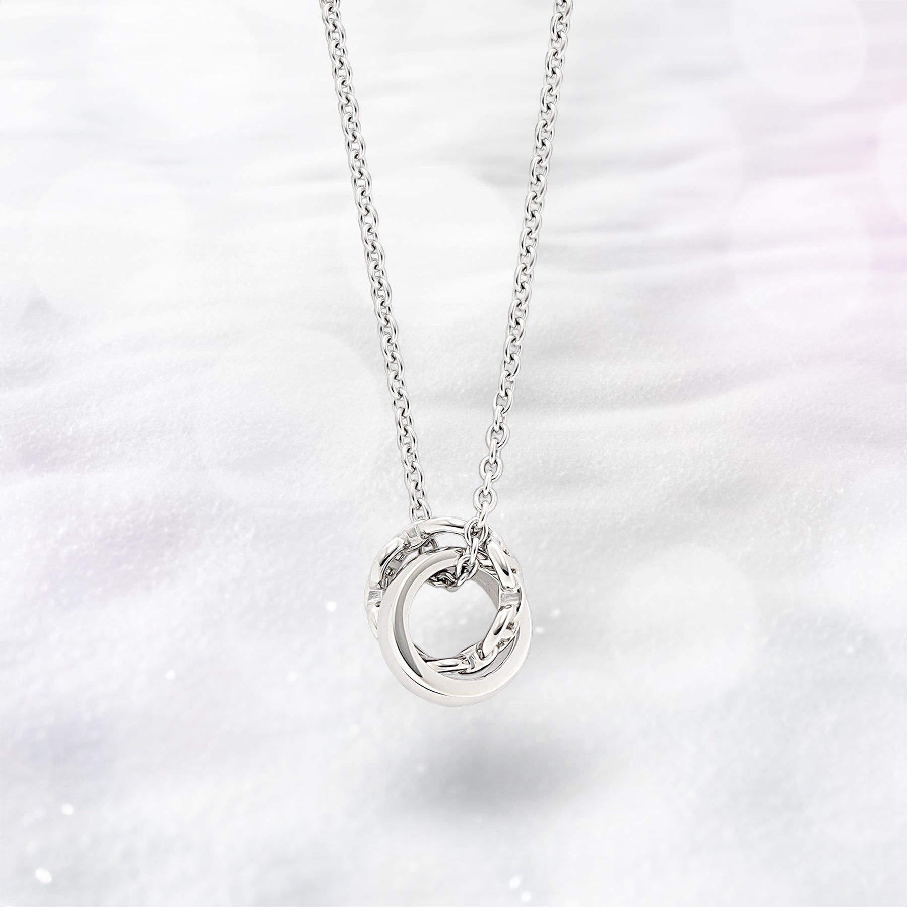 2つの輪を組み合わせたモチーフが胸元のアクセントになるネックレス。