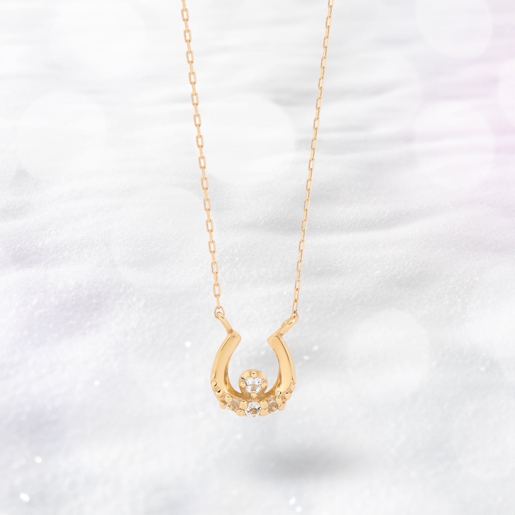 馬蹄モチーフでホワイトトパーズが輝くイエローゴールドのネックレス。