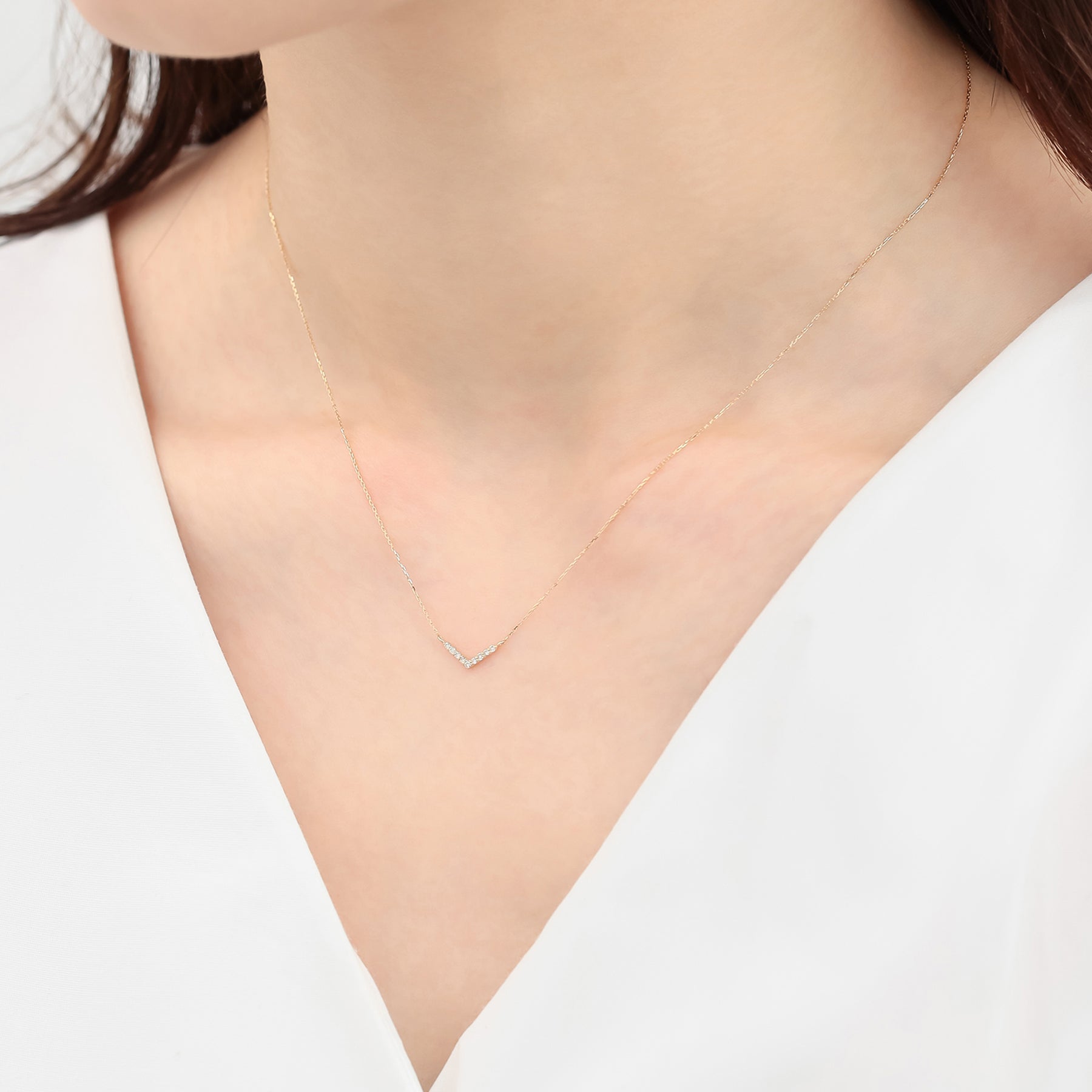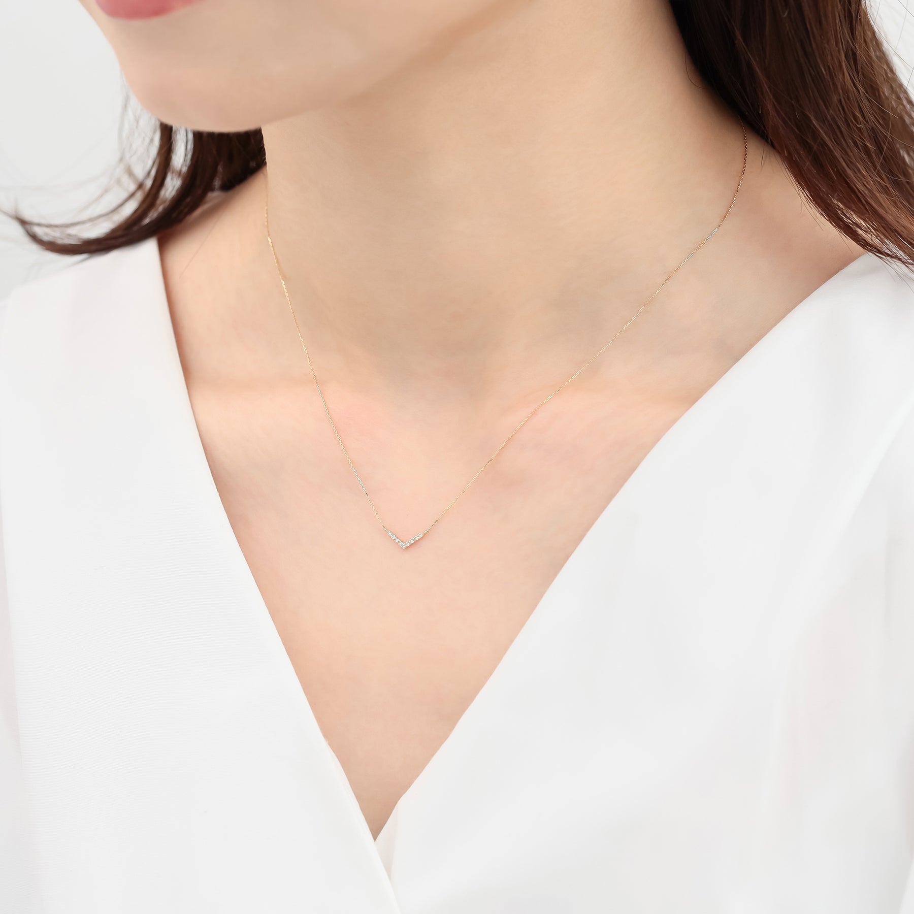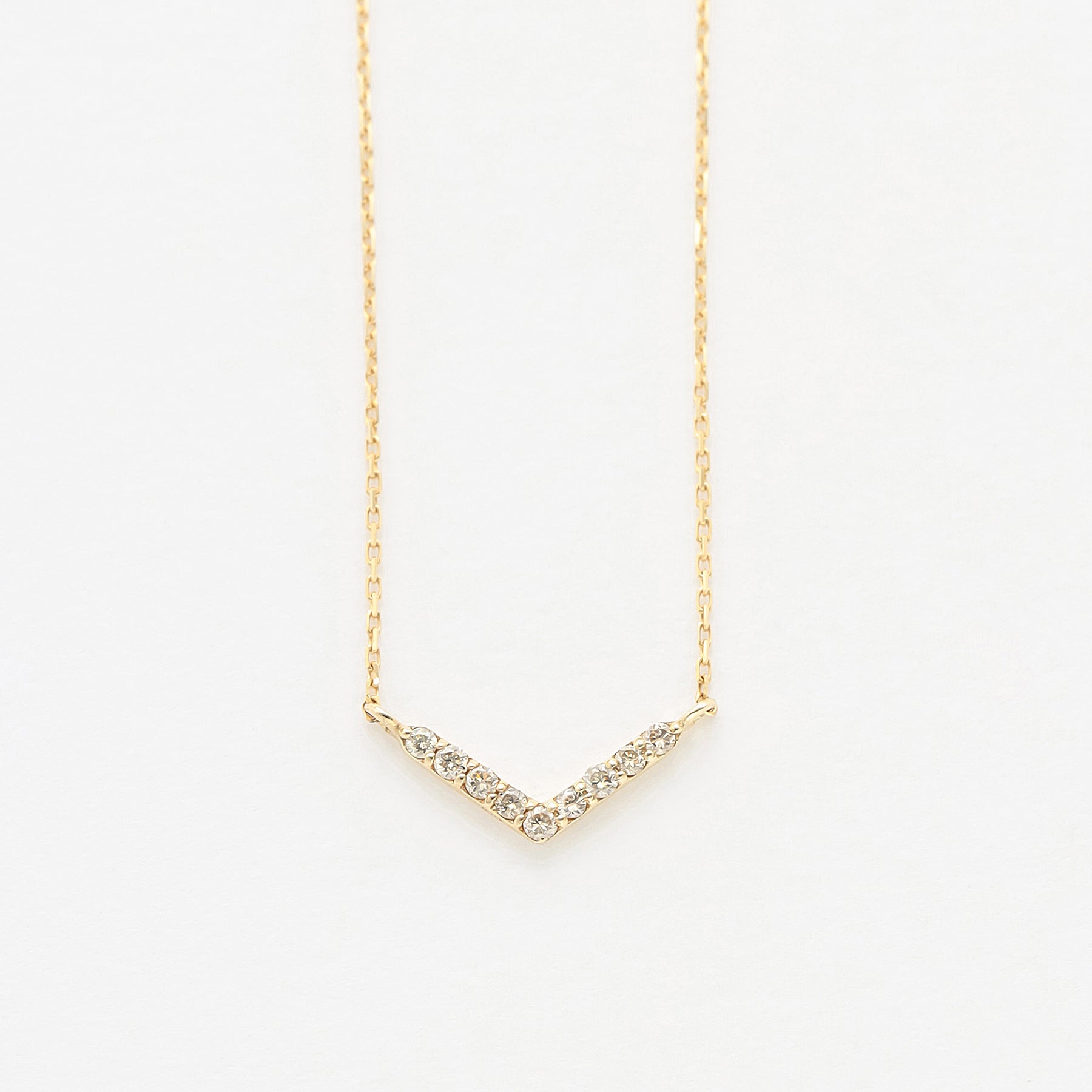 【WEB限定商品】ダイヤモンドを並べたV字のラインが印象的なイエローゴールドのネックレス。繊細な輝きがデコルテを美しく引き立て、顔まわりに上品な華やかさをプラスします。シンプルながら洗練されたデザインのネックレスは、オフィススタイルにも、特別な日の装いにもぴったり。自分へのご褒美や、大切な人へのギフトにも最適なアイテムです。ダイヤモンドは4月の誕生石です。石言葉は「清浄無垢」「永遠の愛」。心身を浄化し周囲にある邪気を払ってくれる力があるとされています。最大の幸福を呼び込むサポートとなってくれそうです。【ATTENTION】※熱や紫外線、湿度の影響により変色や変質、劣化の恐れがございます。ご使用後は柔らかな布で汚れを拭き取ってから、直射日光の当たらない場所での保管をお願いいたします。※天然石は素材の特性により、色や形、風合いなどが画像と多少異なる場合がございます。また、多少のインクルージョンやクラックがある場合がございます。予めご了承ください。※引っ張ったり、強い力を加えると不良や変形の原因となりますので、お取り扱いにはご注意ください。