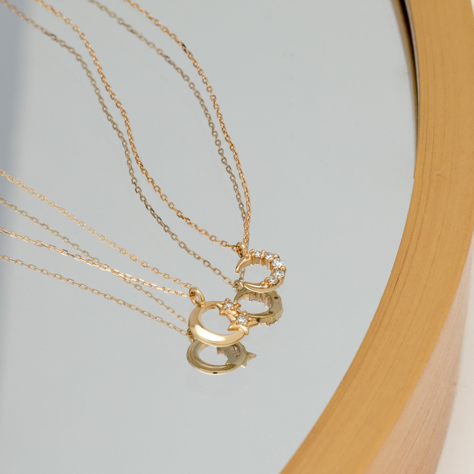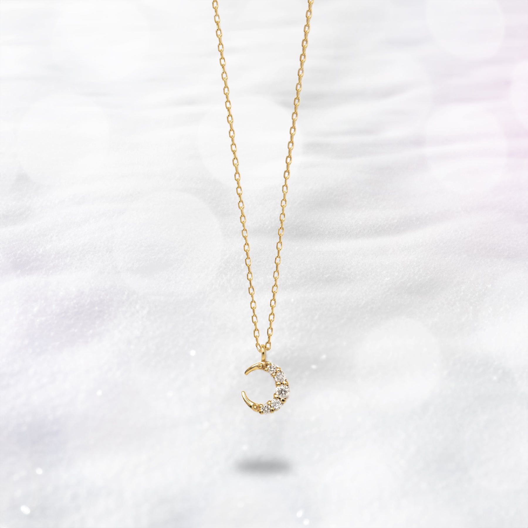 華奢でかわいいシンプルな三日月モチーフネックレス。WEB限定の特別アイテムです。三日月のラインに沿って並んだダイヤモンドが一粒一粒光を受けて華やかに輝きます。カジュアルはもちろん、オフィススタイルまで幅広いコーディネートにお使いいただけるシンプルデザイン。毎日のおしゃれに取り入れて。ダイヤモンドは4月の誕生石です。石言葉は「清浄無垢」「永遠の愛」。心身を浄化し周囲にある邪気を払ってくれる力があるとされています。最大の幸福を呼び込むサポートとなってくれそうです。 【ATTENTION】※熱や紫外線、湿度の影響により変色や変質、劣化の恐れがございます。直射日光の当たらない場所での保管をお願いいたします。ご使用後は柔らかな布で汚れを拭き取ってから保管してください。※天然石、シンセティックストーンは素材の特性により、色や形、風合いなどが画像と多少異なる場合がございます。また、多少のインクルージョンやクラックがある場合がございます。予めご了承ください。※引っ張ったり、強い力を加えると不良の原因となりますので、お取り扱いにはご注意ください。