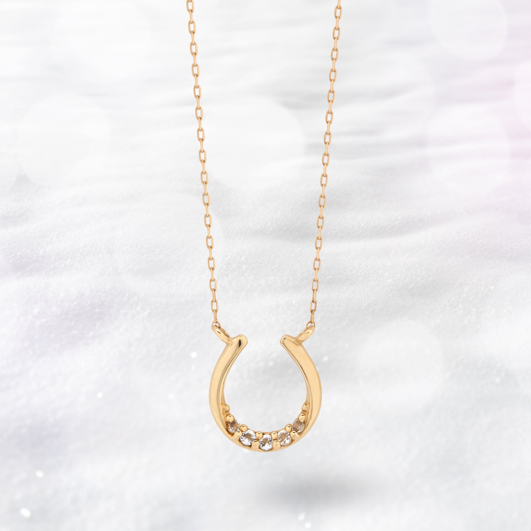 馬蹄モチーフでホワイトトパーズが輝くイエローゴールドのネックレス。