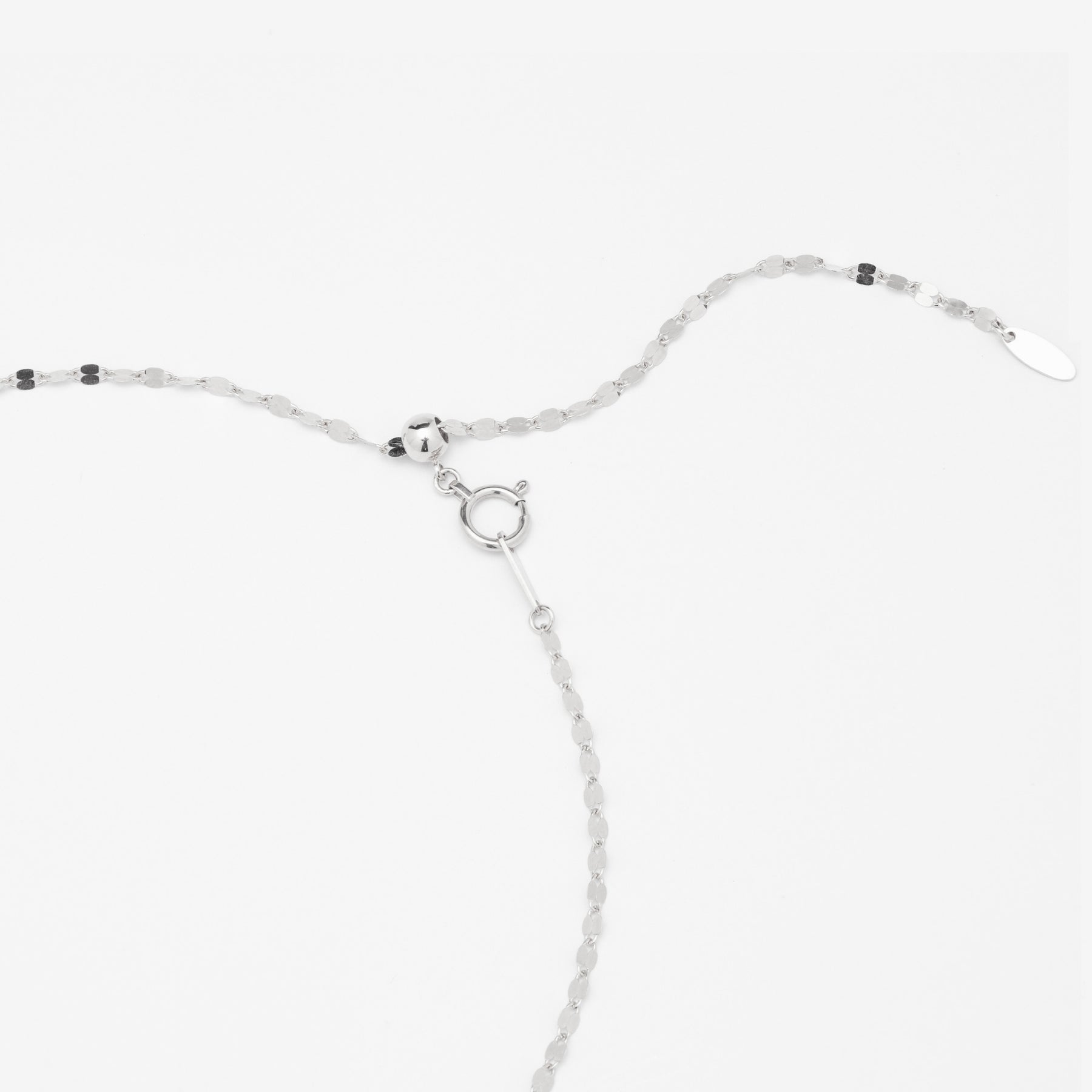 花びらのように煌めくペタルチェーンが、動くたびに繊細な光を反射し、クールで上品なプラチナの光沢がデコルテに凛とした美しさを添えます。