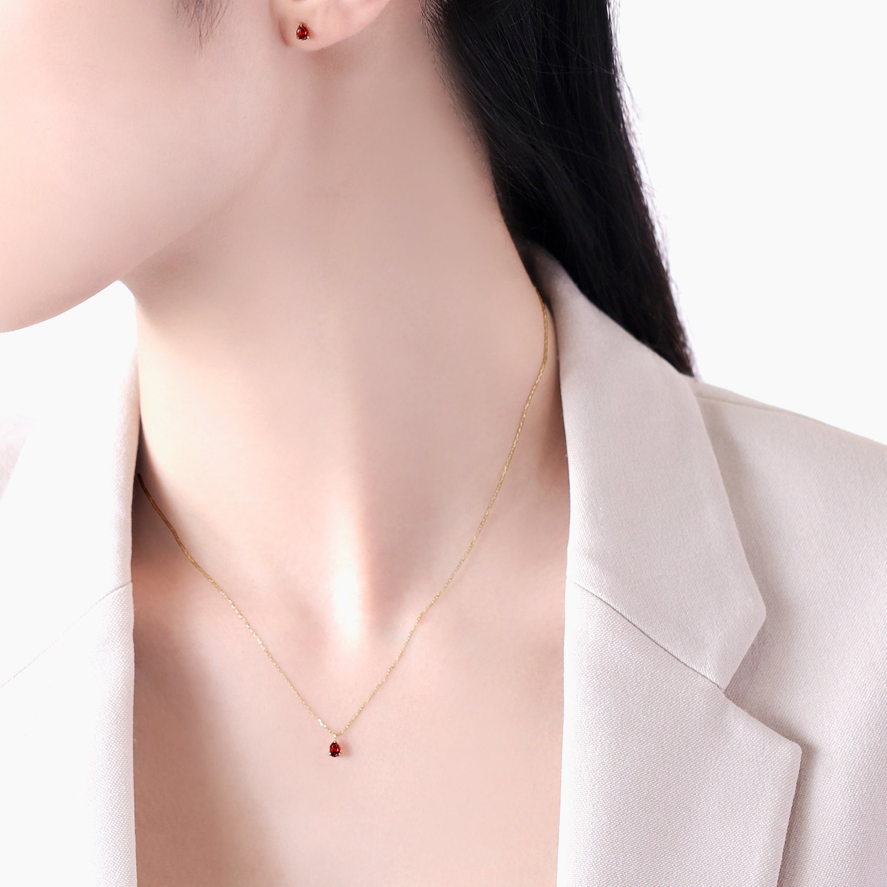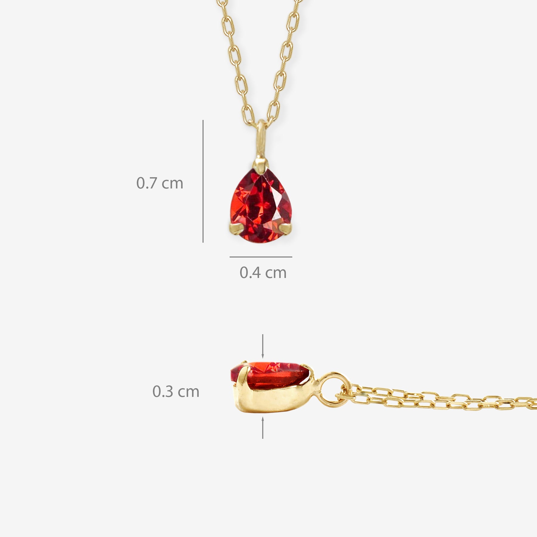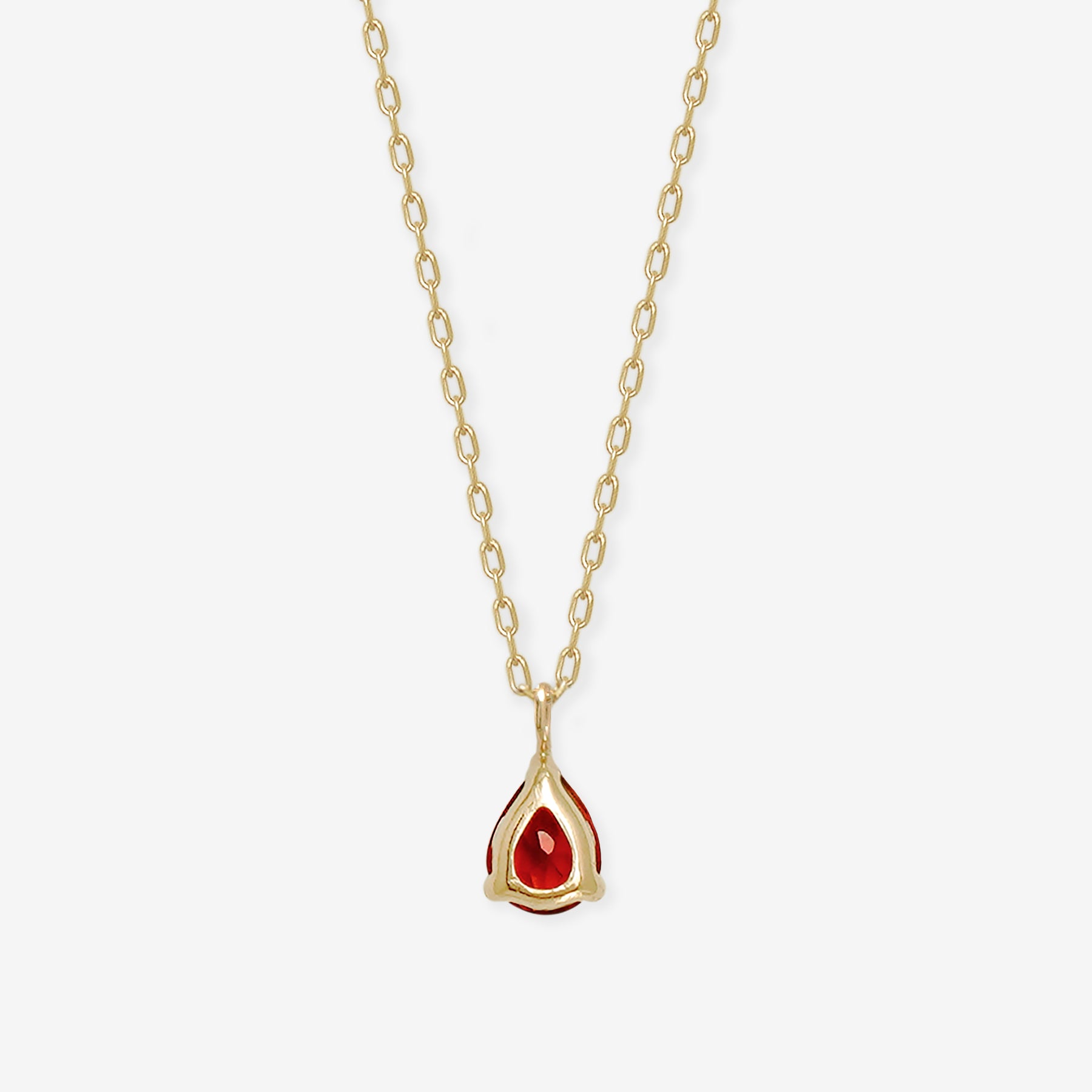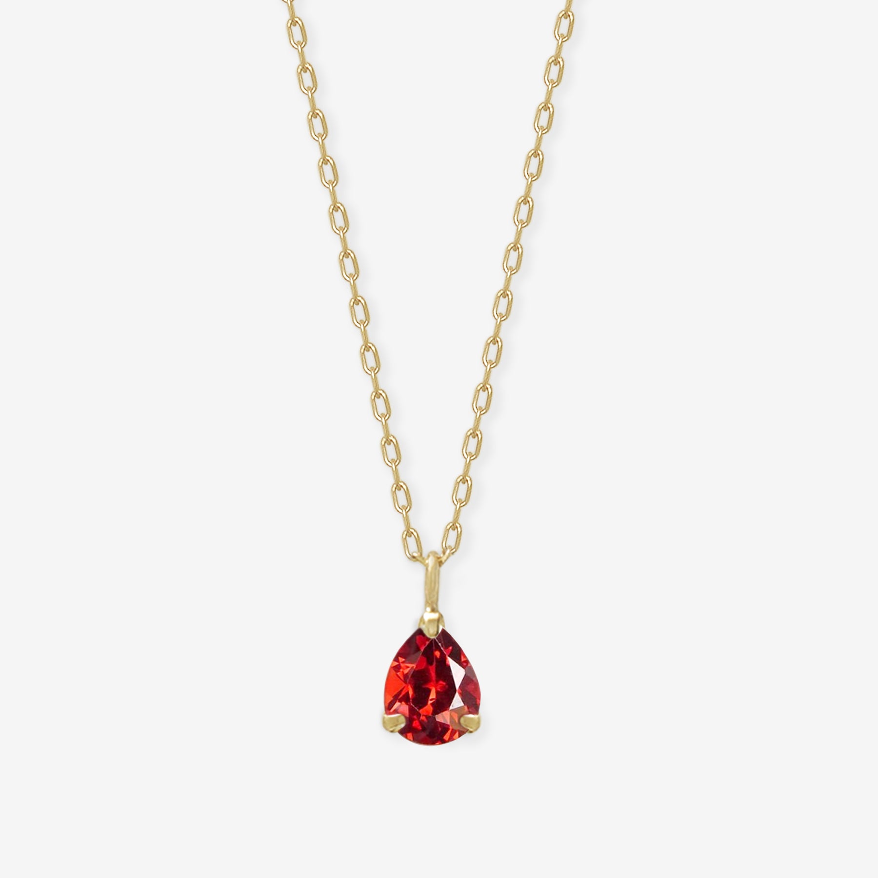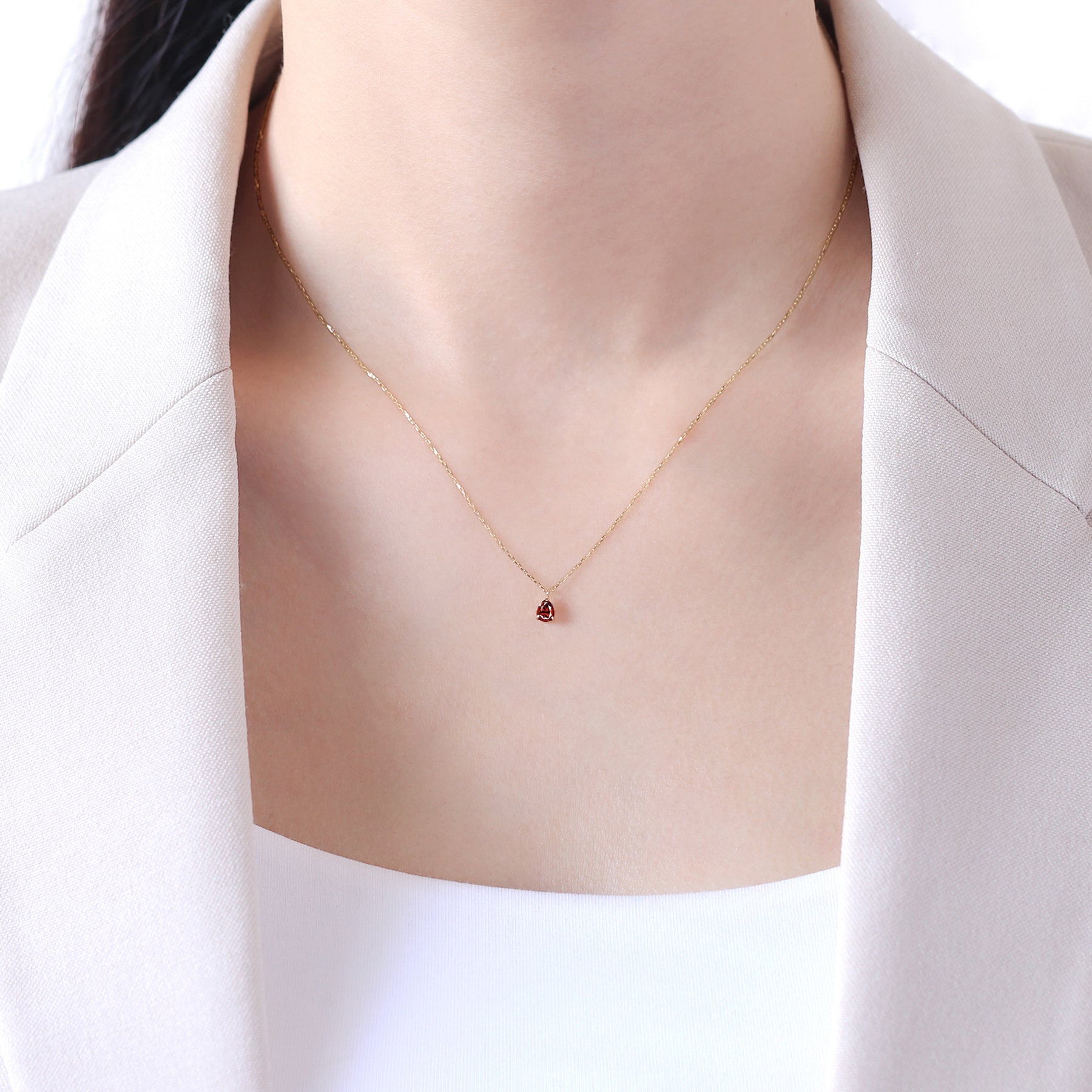 ペアシェイプカットのガーネットをあしらった、イエローゴールドのネックレス。