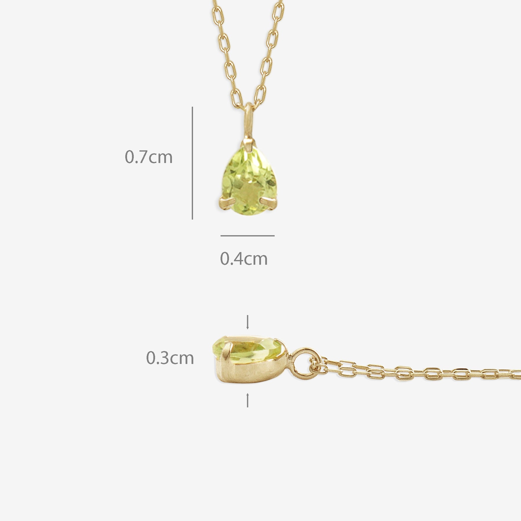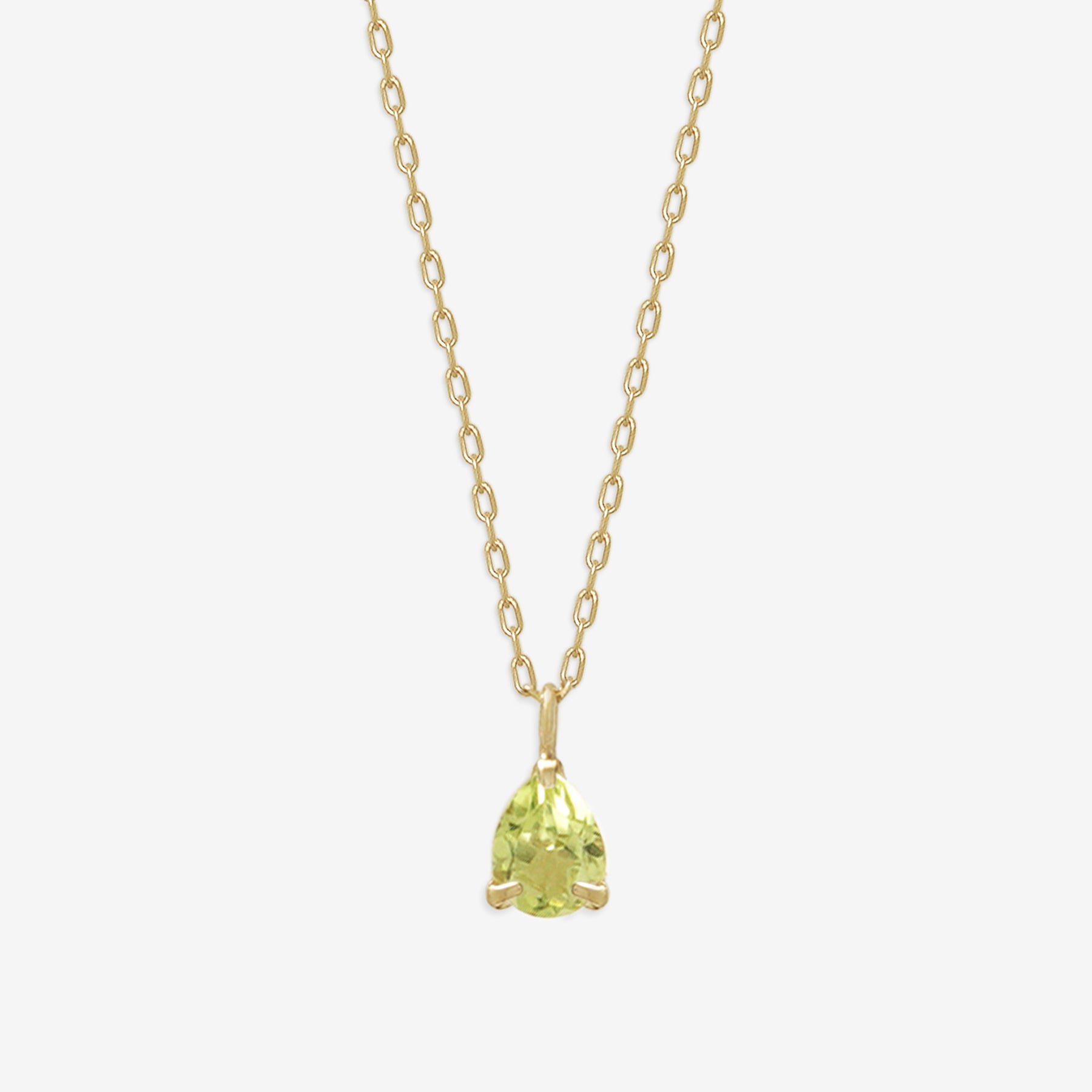 ペアシェイプカットのペリドットをあしらった、イエローゴールドのネックレス。