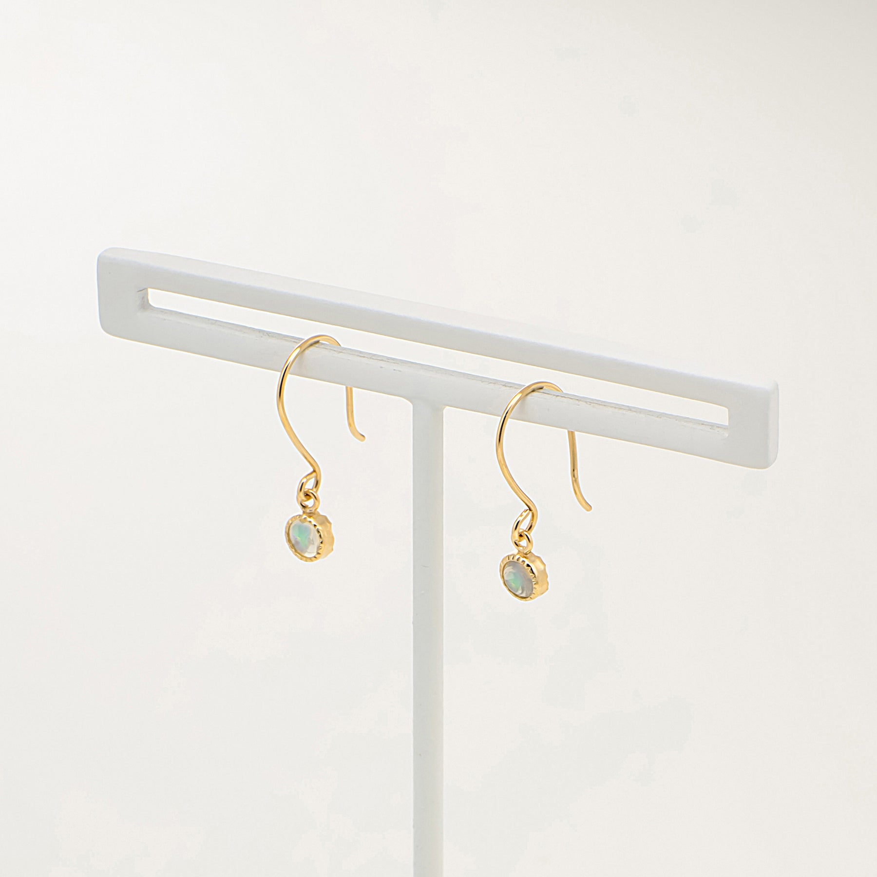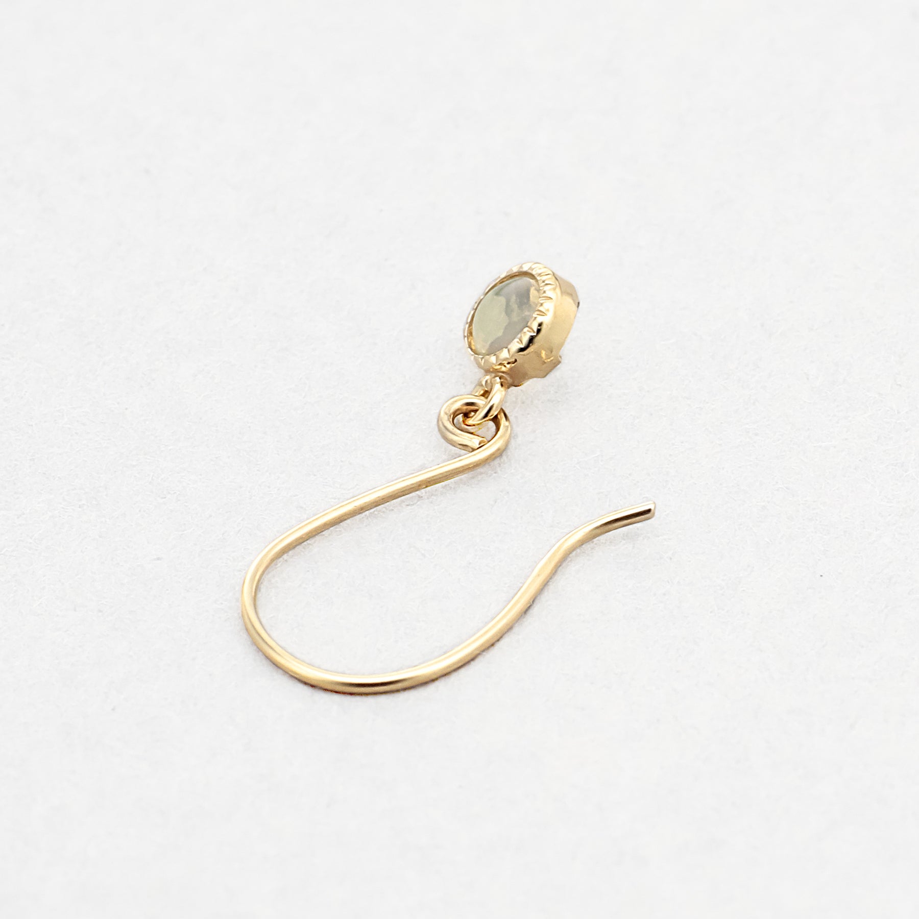 エチオピアオパールの幻想的な彩りが揺れるイエローゴールドのフックピアス。