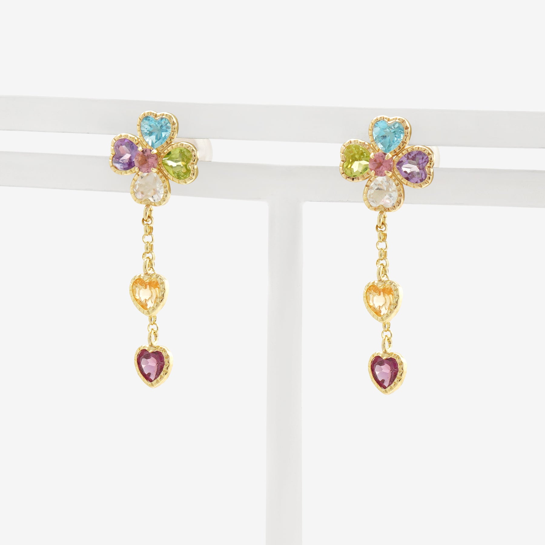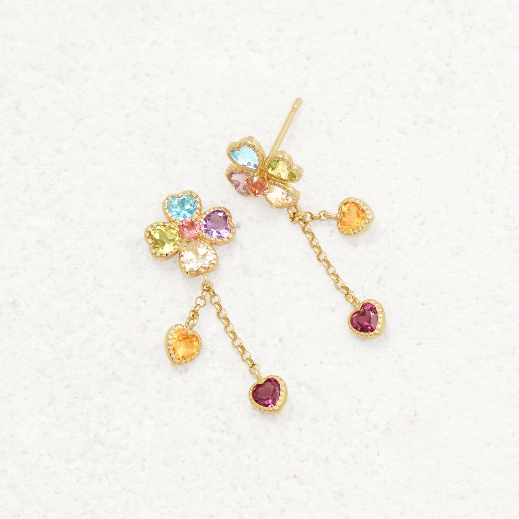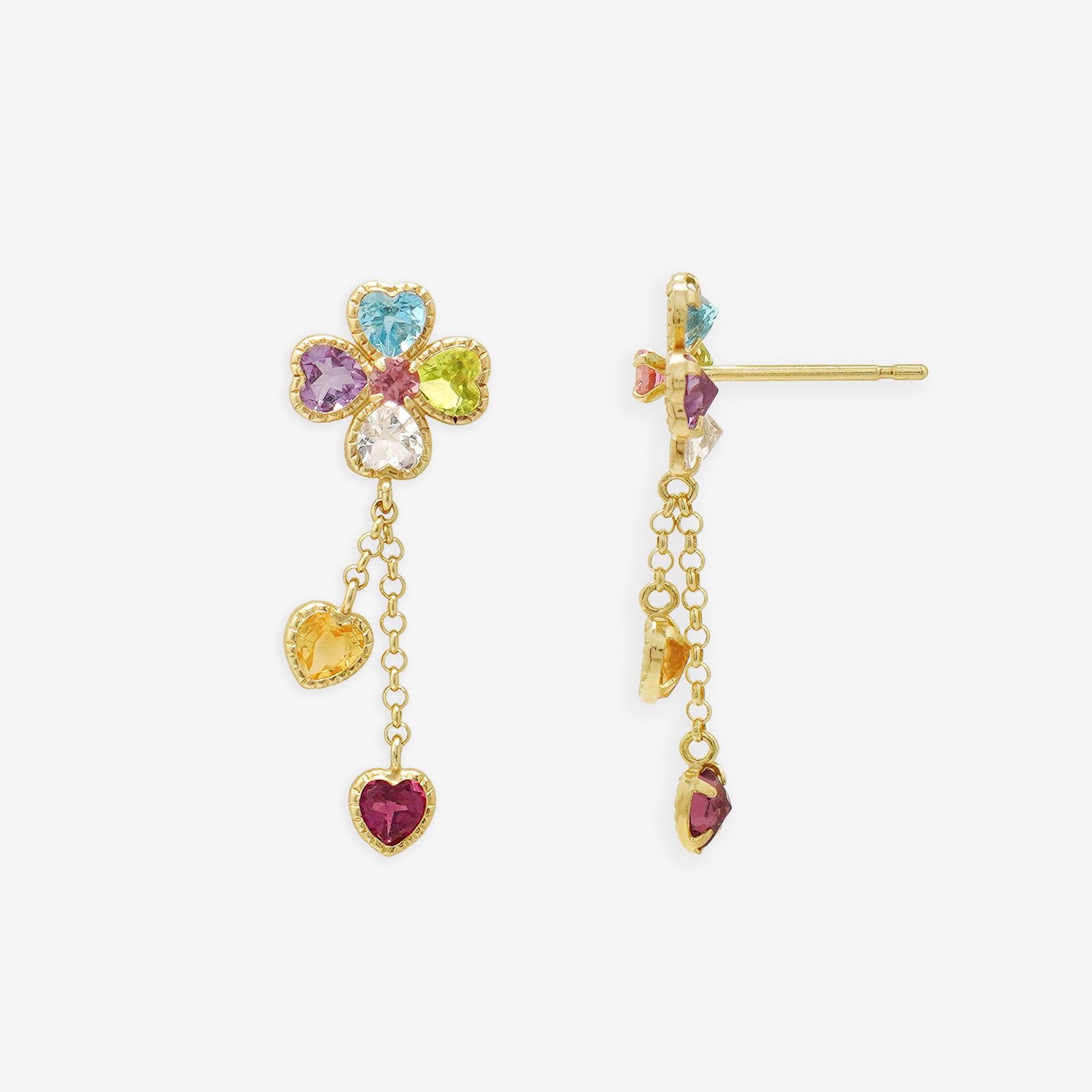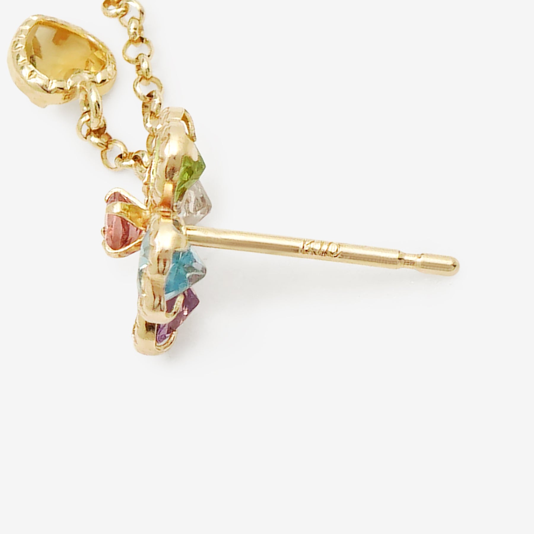 【FOR EARS】色とりどりの天然石がクローバーモチーフで咲き誇るイエローゴールドピアス。ブルートパーズ、ペリドット、アクアマリン、ライトアメジスト、シトリン、ロードライトガーネット、6種類の天然石が繊細に輝き、耳元に華やかな彩りを添えて、表情を明るく見せてくれます。幸運の象徴であるクローバーモチーフに、ひとつひとつ異なる石をあしらうことで、まるで願いを込めた花束のような特別感を演出。カジュアルにもフォーマルにも合わせやすく、毎日のコーディネートにさりげない華やかさをプラスします。自分へのご褒美にはもちろん、大切な人へのギフトにもおすすめのアイテムです。ブルートパーズは11月の誕生石です。石言葉は「友情」「希望」「知性」。仕事運や勉強運を高めてくれるブルートパーズは、「運命的な出会いをもたらす石」とも言われています。【ATTENTION】※熱や紫外線、湿度の影響により変色や変質、劣化の恐れがございます。ご使用後は柔らかな布で汚れを拭き取ってから、直射日光の当たらない場所での保管をお願いいたします。※天然石は素材の特性により、色や形、風合いなどが画像と多少異なる場合がございます。また、多少のインクルージョンやクラックがある場合がございます。予めご了承ください。※天然石は他の宝石と比べて柔らかく傷がつきやすいため、衝撃や摩擦にご注意ください。また、他のジュエリーと触れないように保管してください。※強い力を加えると変形の原因になりますので、お取り扱いにはご注意ください。