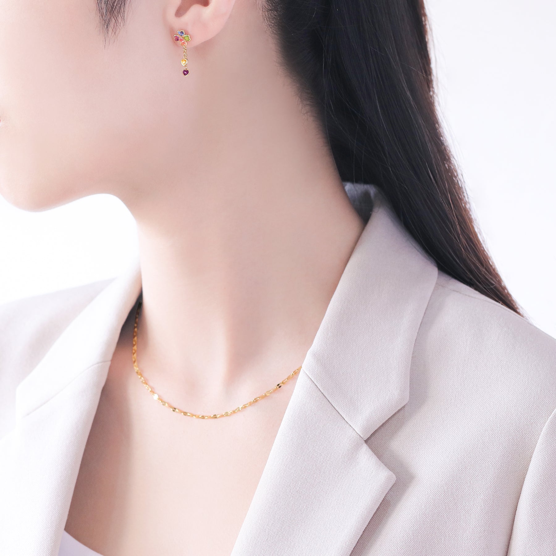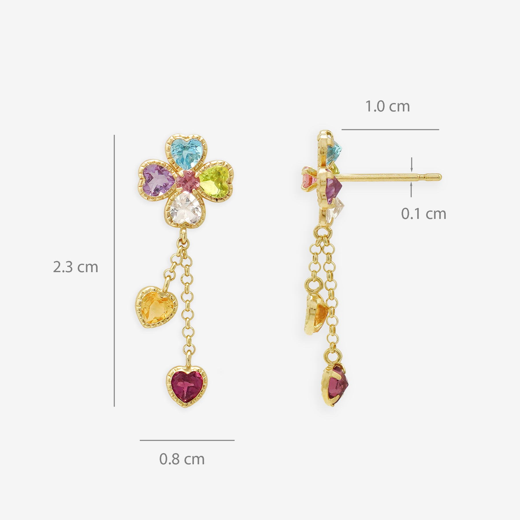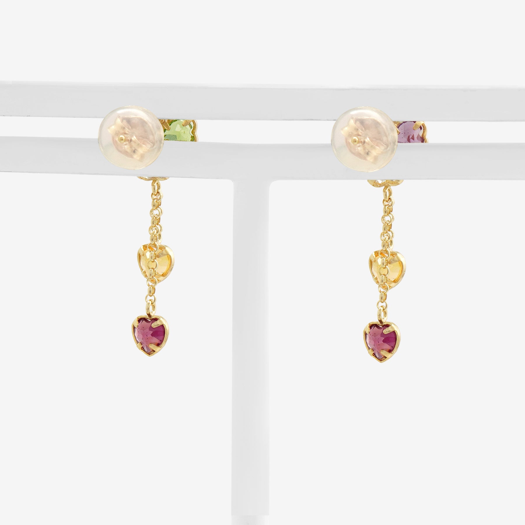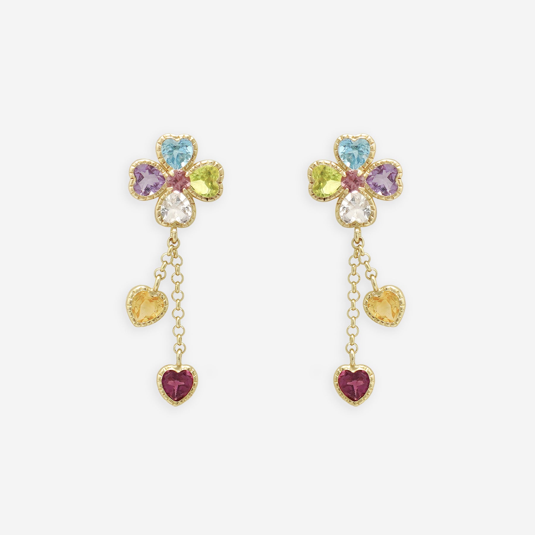 【FOR EARS】色とりどりの天然石がクローバーモチーフで咲き誇るイエローゴールドピアス。ブルートパーズ、ペリドット、アクアマリン、ライトアメジスト、シトリン、ロードライトガーネット、6種類の天然石が繊細に輝き、耳元に華やかな彩りを添えて、表情を明るく見せてくれます。幸運の象徴であるクローバーモチーフに、ひとつひとつ異なる石をあしらうことで、まるで願いを込めた花束のような特別感を演出。カジュアルにもフォーマルにも合わせやすく、毎日のコーディネートにさりげない華やかさをプラスします。自分へのご褒美にはもちろん、大切な人へのギフトにもおすすめのアイテムです。ブルートパーズは11月の誕生石です。石言葉は「友情」「希望」「知性」。仕事運や勉強運を高めてくれるブルートパーズは、「運命的な出会いをもたらす石」とも言われています。【ATTENTION】※熱や紫外線、湿度の影響により変色や変質、劣化の恐れがございます。ご使用後は柔らかな布で汚れを拭き取ってから、直射日光の当たらない場所での保管をお願いいたします。※天然石は素材の特性により、色や形、風合いなどが画像と多少異なる場合がございます。また、多少のインクルージョンやクラックがある場合がございます。予めご了承ください。※天然石は他の宝石と比べて柔らかく傷がつきやすいため、衝撃や摩擦にご注意ください。また、他のジュエリーと触れないように保管してください。※強い力を加えると変形の原因になりますので、お取り扱いにはご注意ください。