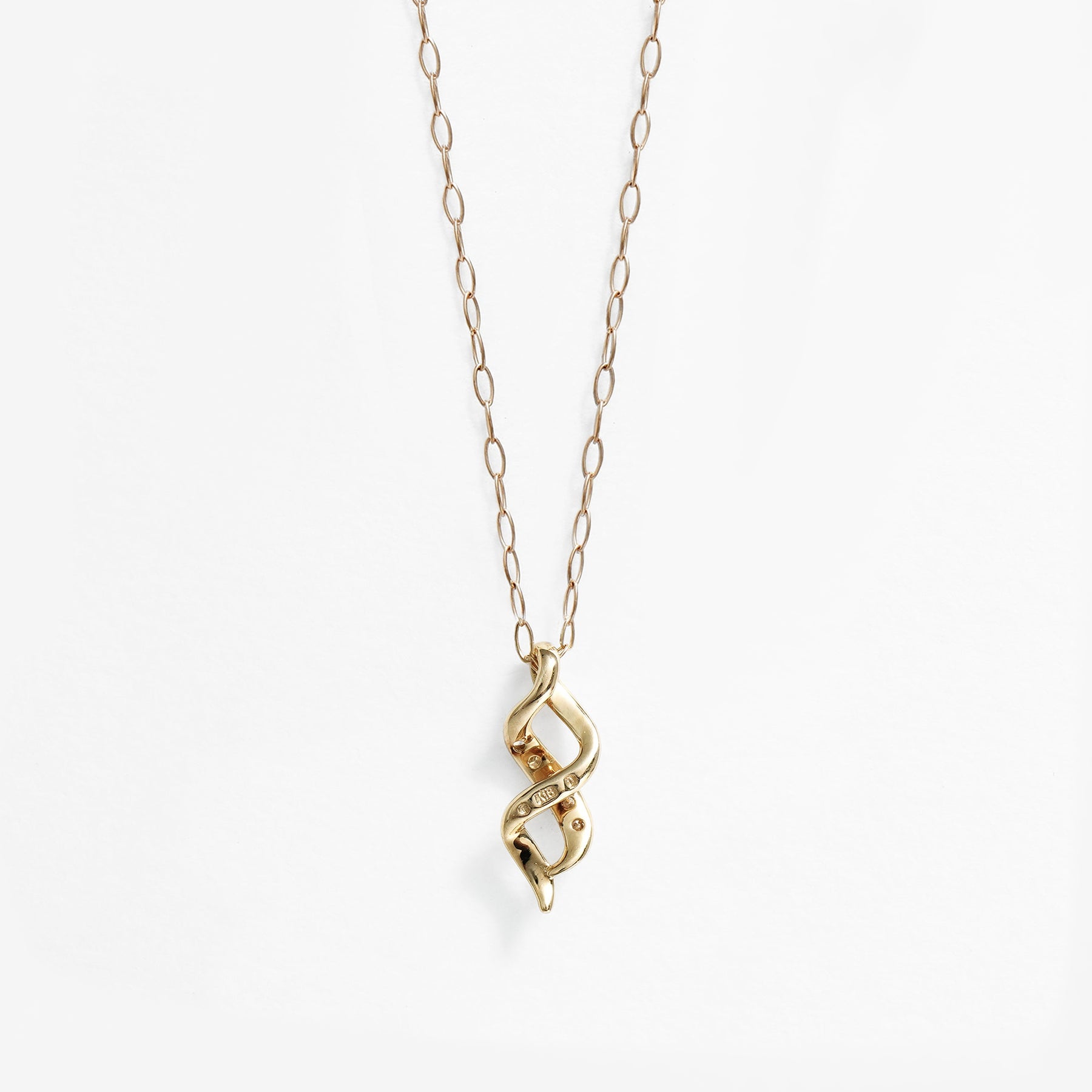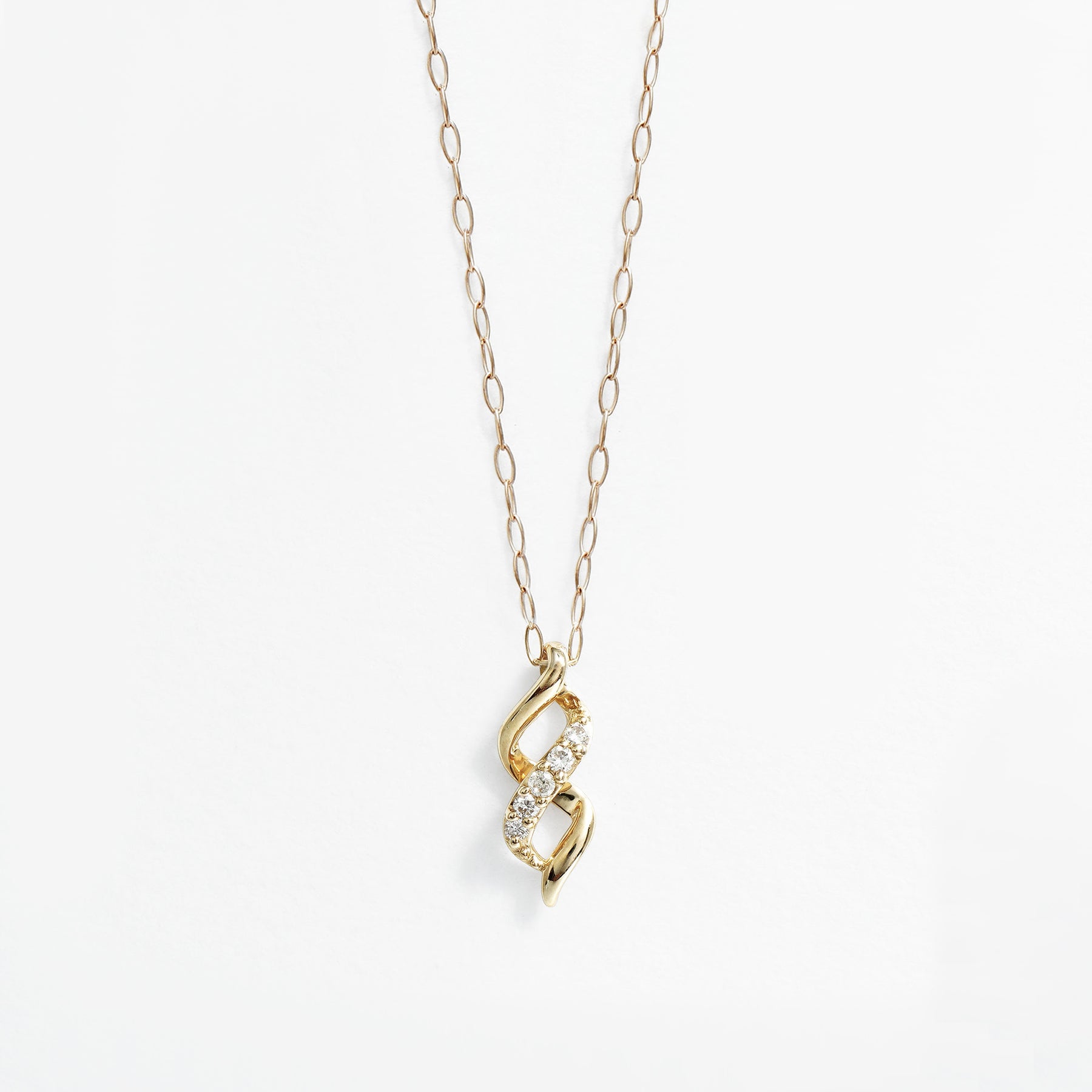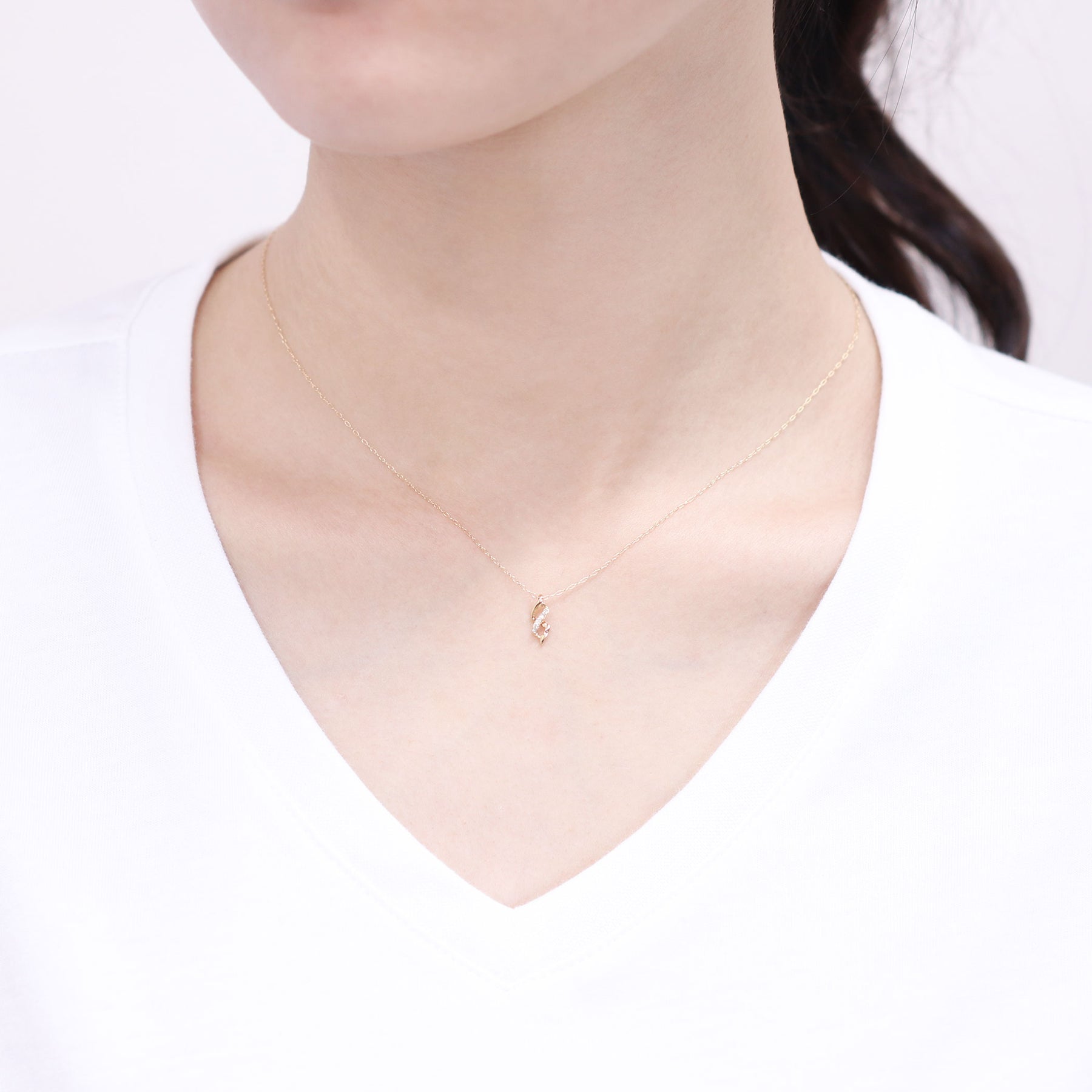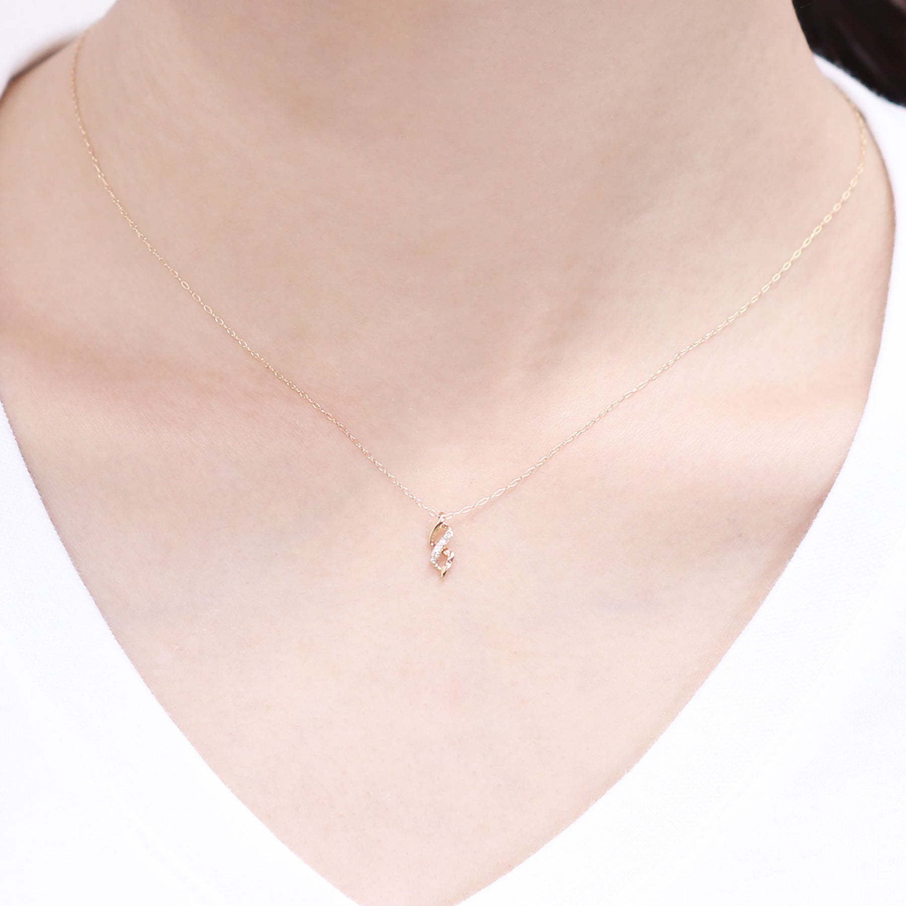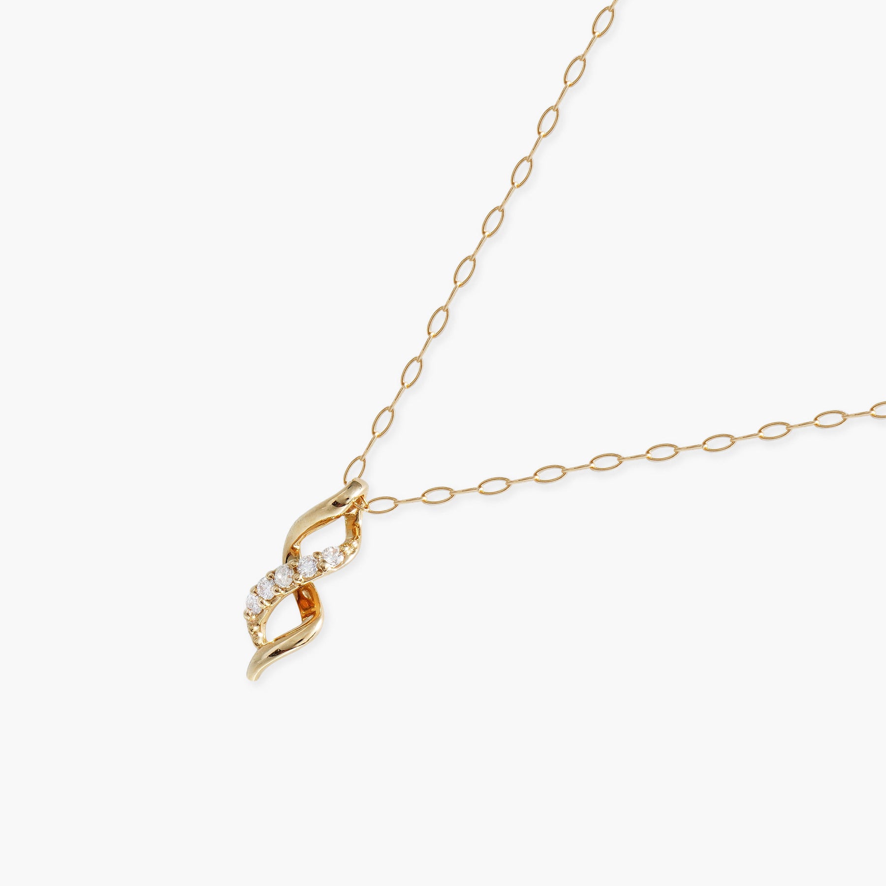 イエローゴールドのラインがしなやかに交差するモチーフに、ダイヤモンドが繊細な輝きを添えるネックレス。