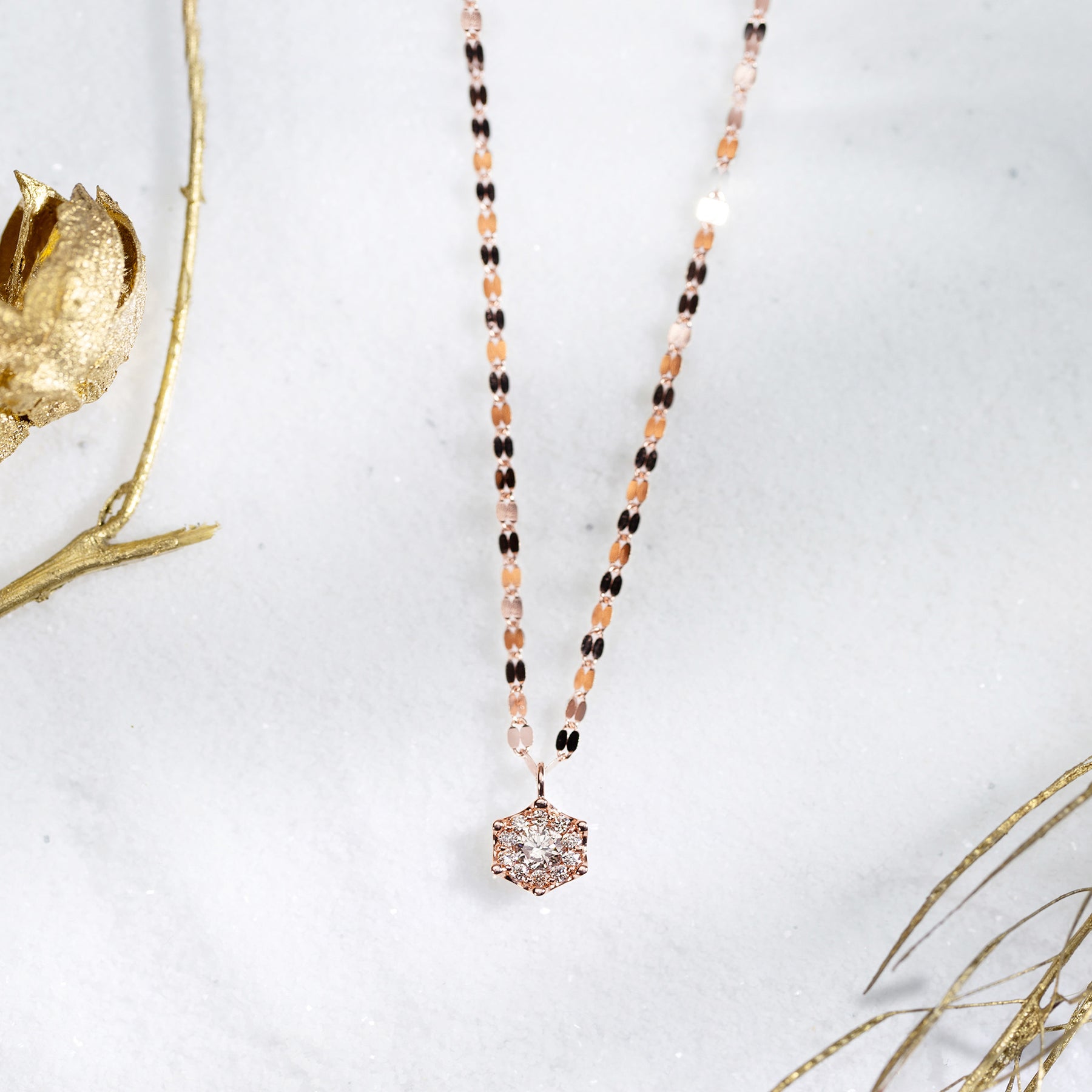花びらのようなピンクゴールドのパーツが光を集めきらめくダイヤモンドネックレス。